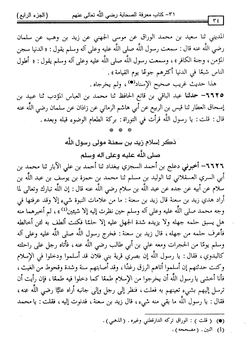 6626 - أَخْبَرَنِي دَعْلَجُ بْنُ أَحْمَدَ السِّجْزِيُّ ، بِبَغْدَادَ ، ثَنَا أَحْمَدُ بْنُ عَلِيٍّ الْأَبَّارُ ، ثَنَا مُحَمَّدُ بْنُ أَبِي السَّرِيِّ الْعَسْقَلَانِيُّ ، ثَنَا الْوَلِيدُ بْنُ مُسْلِمٍ ، ثَنَا مُحَمَّدُ بْنُ حَمْزَةَ بْنِ يُوسُفَ بْنِ عَبْدِ اللَّهِ بْنِ سَلَامٍ ، عَنْ أَبِيهِ ، عَنْ جَدِّهِ ، عَنْ عَبْدِ اللَّهِ بْنِ سَلَامٍ رَضِيَ اللَّهُ عَنْهُ ، قَالَ: إِنَّ اللَّهَ تَبَارَكَ وَتَعَالَى لَمَّا أَرَادَ هَدْيَ زَيْدِ بْنِ سَعْنَةَ ، قَالَ زَيْدُ بْنُ سَعْنَةَ: مَا مِنْ عَلَامَاتِ النُّبُوَّةِ شَيْءٌ إِلَّا وَقَدْ عَرَفْتُهَا فِي وَجْهِ مُحَمَّدٍ صَلَّى اللَّهُ عَلَيْهِ وَسَلَّمَ حِينَ نَظَرْتُ إِلَيْهِ إِلَّا شَيْئَيْنِ لَمْ أَخْبُرْهُمَا مِنْهُ هَلْ يَسْبِقُ " حُلْمُهُ جَهْلَهُ ، وَلَا يَزِيدُهُ شِدَّةُ الْجَهْلِ عَلَيْهِ إِلَّا حِلْمًا " ، فَكُنْتُ أَلْطُفُ بِهِ لَئِنْ أُخَالِطَهُ فَأَعْرِفُ حِلْمَهُ مِنْ جَهْلِهِ ، قَالَ زَيْدُ بْنُ سَعْنَةَ فَخَرَجَ رَسُولُ اللَّهِ صَلَّى اللَّهُ عَلَيْهِ وَسَلَّمَ يَوْمًا مِنَ الْحُجُرَاتِ ، وَمَعَهُ عَلِيُّ بْنُ أَبِي طَالِبٍ رَضِيَ اللَّهُ عَنْهُ فَأَتَاهُ رَجُلٌ عَلَى رَاحِلَتِهِ كَالْبَدَوِيِّ ، فَقَالَ: يَا رَسُولَ اللَّهِ إِنَّ بُصْرَى قَرْيَةُ بَنِي فُلَانٍ قَدْ أَسْلَمُوا وَدَخَلُوا فِي الْإِسْلَامِ ، وَكُنْتُ حَدَّثَتْهُمْ إِنْ أَسْلَمُوا آتَاهُمُ الرِّزْقُ رَغَدًا وَقَدْ أَصَابَتْهُمْ سَنَةٌ وَشِدَّةٌ وَقُحُوطٌ مِنَ الْغَيْثِ ، فَأَنَا أَخْشَى يَا رَسُولَ اللَّهِ أَنْ يَخْرُجُوا مِنَ الْإِسْلَامِ طَمَعًا كَمَا دَخَلُوا فِيهِ طَمَعًا ، فَإِنْ رَأَيْتَ أَنْ تُرْسِلَ إِلَيْهِمْ بِشَيْءٍ تُعِينُهُمْ بِهِ فَعَلْتَ فَنَظَرَ إِلَيَّ رَجُلٌ وَإِلَى جَانِبِهِ أُرَاهُ عَلِيًّا رَضِيَ اللَّهُ عَنْهُ ، فَقَالَ: يَا رَسُولَ اللَّهِ مَا بَقِيَ مِنْهُ شَيْءٌ ، قَالَ زَيْدُ بْنُ سَعْنَةَ: فَدَنَوْتُ إِلَيْهِ فَقُلْتُ: يَا مُحَمَّدُ -[35]- هَلْ لَكَ أَنْ تَبِيعَنِي تَمْرًا مَعْلُومًا مِنْ حَائِطِ بَنِي فُلَانٍ إِلَى أَجَلِ كَذَا وَكَذَا ، فَقَالَ: " لَا يَا يَهُودِيُّ ، وَلَكِنْ أَبِيعُكَ تَمْرًا مَعْلُومًا إِلَى أَجَلِ كَذَا وَكَذَا ، وَلَا أُسَمِّيَ حَائِطَ بَنِي فُلَانٍ " فَقُلْتُ: نَعَمْ ، فَبَايَعَنِي فَأَطْلَقْتُ هِمْيَانِي فَأَعْطَيْتُهُ ثَمَانِينَ مِثْقَالًا مِنْ ذَهَبٍ فِي تَمْرٍ مَعْلُومٍ إِلَى أَجَلِ كَذَا وَكَذَا فَأَعْطَاهَا الرَّجُلُ ، فَقَالَ: اعْدِلْ عَلَيْهِمْ وَأَعِنْهُمْ بِهَا ، فَقَالَ زَيْدُ بْنُ سَعْنَةَ: فَلَمَّا كَانَ قَبْلَ مَحَلِّ الْأَجَلِ بِيَوْمَيْنِ أَوْ ثَلَاثَةٍ أَتَيْتُهُ فَأَخَذْتُ بِمَجَامِعِ قَمِيصِهِ وَرِدَائِهِ وَنَظَرْتُ إِلَيْهِ بِوَجْهٍ غَلِيظٍ فَقُلْتُ لَهُ: أَلَا تَقْضِيَنِي يَا مُحَمَّدُ حَقِّي فَوَاللَّهِ مَا عُلِمْتُمْ يَا بَنِي عَبْدِ الْمُطَّلِبِ سَيِّئَ الْقَضَاءِ مَطْلٌ ، وَلَقَدْ كَانَ لِي بِمُخَالَطَتِكُمْ عِلْمٌ وَنَظَرْتُ إِلَى عُمَرَ فَإِذَا عَيْنَاهُ تَدُورَانِ فِي وَجْهِهِ كَالْفَلَكِ الْمُسْتَدِيرِ ، ثُمَّ رَمَانِي بِبَصَرِهِ ، فَقَالَ: يَا عَدُوَّ اللَّهِ أَتَقُولُ لِرَسُولِ اللَّهِ صَلَّى اللَّهُ عَلَيْهِ وَسَلَّمَ مَا أَسْمَعُ وَتَصْنَعَ بِهِ مَا أَرَى فَوَالَّذِي بَعَثَهُ بِالْحَقِّ لَوْلَا مَا أُحَاذِرُ قُوَّتَهُ لَضَرَبْتُ بِسَيْفِي رَأْسَكَ وَرَسُولُ اللَّهِ صَلَّى اللَّهُ عَلَيْهِ وَسَلَّمَ يَنْظُرُ إِلَى عُمَرَ فِي سُكُونٍ وَتُؤَدَةٍ وَتَبَسَّمَ ، ثُمَّ قَالَ: " يَا عُمَرُ أَنَا وَهُوَ كُنَّا أَحْوَجَ إِلَى غَيْرِ هَذَا أَنْ تَأْمُرَنِي بِحُسْنِ الْأَدَاءِ ، وَتَأْمُرَهُ بِحُسْنِ التِّبَاعَةِ اذْهَبْ بِهِ يَا عُمَرُ فَاعْطِهِ حَقَّهُ ، وَزِدْهُ عِشْرِي