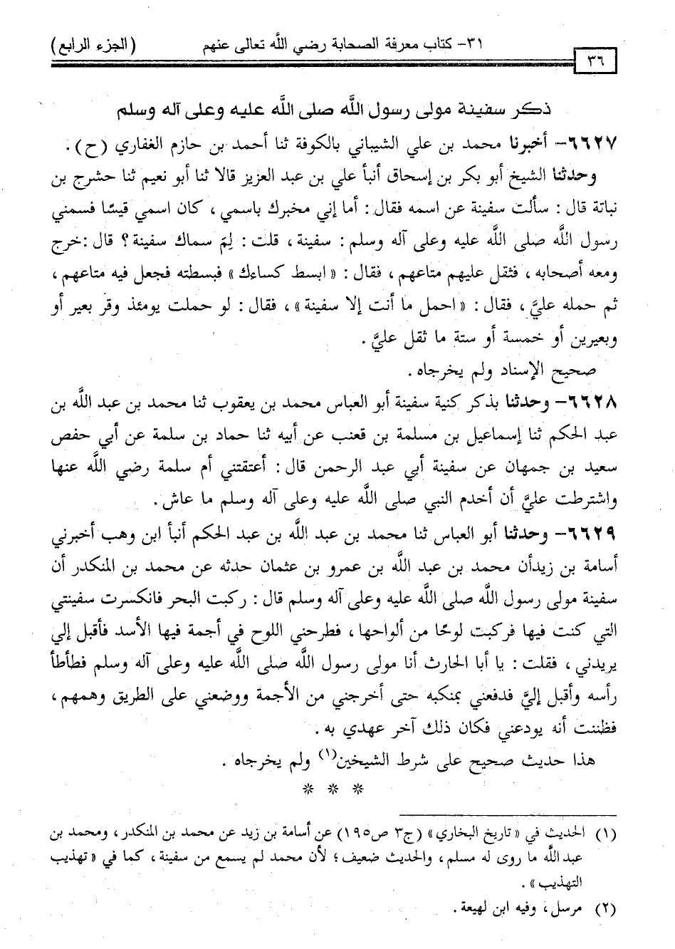 6627 - أَخْبَرَنَا مُحَمَّدُ بْنُ عَلِيٍّ الشَّيْبَانِيُّ ، بِالْكُوفَةِ ، ثَنَا أَحْمَدُ بْنُ حَازِمٍ الْغِفَارِيُّ ، ح وَحَدَّثَنَا الشَّيْخُ أَبُو بَكْرِ بْنُ إِسْحَاقَ ، أَنْبَأَ عَلِيُّ بْنُ عَبْدِ الْعَزِيزِ ، قَالَا: ثَنَا أَبُو نُعَيْمٍ ، ثَنَا حَشْرَجُ بْنُ نُبَاتَةَ ، قَالَ: سَأَلْتُ سَفِينَةَ ، عَنِ اسْمِهِ فَقَالَ: أَمَا " إِنِّي مُخْبِرُكَ بِاسْمِي كَانَ اسْمِي قَيْسًا فَسَمَّانِي رَسُولُ اللَّهِ صَلَّى اللَّهُ عَلَيْهِ وَسَلَّمَ سَفِينَةَ " قُلْتُ: لِمَ سَمَّاكَ سَفِينَةَ ؟ قَالَ: خَرَجَ وَمَعَهُ أَصْحَابُهُ فَثَقُلَ عَلَيْهِمْ مَتَاعُهُمْ ، فَقَالَ: ابْسُطْ كِسَاءَكَ فَبَسَطْتُهُ فَجَعَلَ فِيهِ مَتَاعَهُمْ ، ثُمَّ حَمَلَهُ عَلَيَّ فَقَالَ: احْمِلْ مَا أَنْتَ إِلَّا سَفِينَةُ ، فَقَالَ: لَوْ حَمَلْتُ يَوْمَئِذٍ وَقْرَ بَعِيرٍ أَوْ بَعِيرَيْنِ أَوْ خَمْسَةٍ أَوْ سِتَّةٍ مَا ثَقُلَ عَلَيَّ " صَحِيحُ الْإِسْنَادِ ، وَلَمْ يُخَرِّجَاهُ