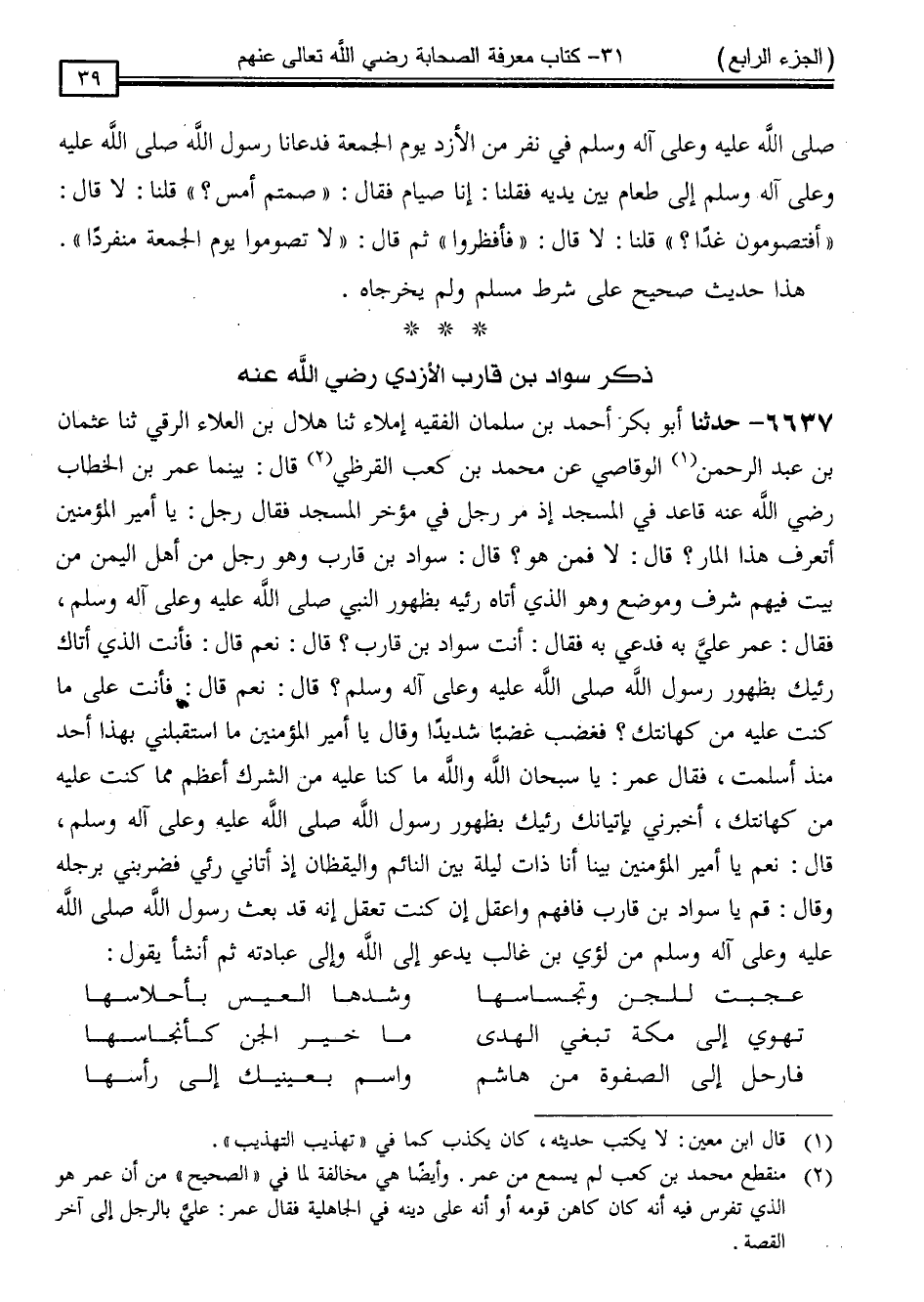 6637 - حَدَّثَنَا أَبُو بَكْرٍ أَحْمَدُ بْنُ سَلْمَانَ الْفَقِيهُ ، إِمْلَاءً ثَنَا هِلَالُ بْنُ الْعَلَاءِ الرَّقِّيُّ ، ثَنَا عُثْمَانُ بْنُ عَبْدِ الرَّحْمَنِ الْوَقَّاصِيُّ ، عَنْ مُحَمَّدِ بْنِ كَعْبٍ الْقُرَظِيِّ ، قَالَ: بَيْنَمَا عُمَرُ بْنُ الْخَطَّابِ رَضِيَ اللَّهُ عَنْهُ قَاعِدٌ فِي الْمَسْجِدِ إِذْ مَرَّ رَجُلٌ فِي مُؤَخَّرِ الْمَسْجِدِ ، فَقَالَ رَجُلٌ: يَا أَمِيرَ الْمُؤْمِنِينَ أَتَعْرِفُ هَذَا الْمَارَّ ، قَالَ: لَا ، فَمَنْ هُوَ ؟ قَالَ: سَوَادُ بْنُ قَارِبٍ وَهُوَ رَجُلٌ مِنْ أَهْلِ الْيَمَنِ مِنْ بَيْتٍ فِيهِمْ شَرَفٌ وَمَوْضِعٌ وَهُوَ الَّذِي أَتَاهُ رَئِيُّهُ بِظُهُورِ النَّبِيِّ صَلَّى اللَّهُ عَلَيْهِ وَسَلَّمَ ، فَقَالَ عُمَرُ عَلَيَّ بِهِ فَدُعِيَ بِهِ ، فَقَالَ: أَنْتَ سَوَادُ بْنُ قَارِبٍ ، قَالَ: نَعَمْ ، قَالَ: فَأَنْتَ الَّذِي أَتَاكَ رَئِيُّكَ بِظُهُورِ رَسُولِ اللَّهِ صَلَّى اللَّهُ عَلَيْهِ وَسَلَّمَ ، قَالَ: نَعَمْ ، قَالَ: فَأَنْتَ عَلَى مَا كُنْتَ عَلَيْهِ مِنْ كَهَانَتِكَ فَغَضِبَ غَضَبًا شَدِيدًا ، وَقَالَ: يَا أَمِيرَ الْمُؤْمِنِينَ مَا اسْتَقْبَلَنِي بِهَذَا أَحَدٌ مُنْذُ أَسْلَمْتُ ، فَقَالَ عُمَرُ: يَا سُبْحَانَ اللَّهِ وَاللَّهِ مَا كُنَّا عَلَيْهِ مِنَ الشِّرْكِ أَعْظَمَ مِمَّا كُنْتَ عَلَيْهِ مِنْ كَهَانَتِكَ ، أَخْبَرَنِي بِإِتْيَانِكَ رَئِيُّكَ بِظُهُورِ رَسُولِ اللَّهِ صَلَّى اللَّهُ عَلَيْهِ وَسَلَّمَ ، قَالَ: نَعَمْ ، يَا أَمِيرَ الْمُؤْمِنِينَ بَيْنَا أَنَا ذَاتَ لَيْلَةٍ بَيْنَ النَّائِمِ وَالْيَقْظَانِ ، إِذْ أَتَانِي رَئِيٌّ فَضَرَبَنِي بِرِجْلِهِ ، وَقَالَ قُمْ يَا سَوَّادُ بْنُ قَارِبٍ فَافْهَمْ وَاعْقِلْ إِنْ كُنْتَ تَعْقِلُ إِنَّهُ قَدْ بَعَثَ رَسُولُ اللَّهِ صَلَّى اللَّهُ عَلَيْهِ وَسَلَّمَ مِنْ لُؤَيِّ بْنِ غَالِبٍ يَدْعُو إِلَى اللَّهِ وَإِلَى عِبَادَتِهِ ، ثُمَّ أَنْشَأَ يَقُولُ: