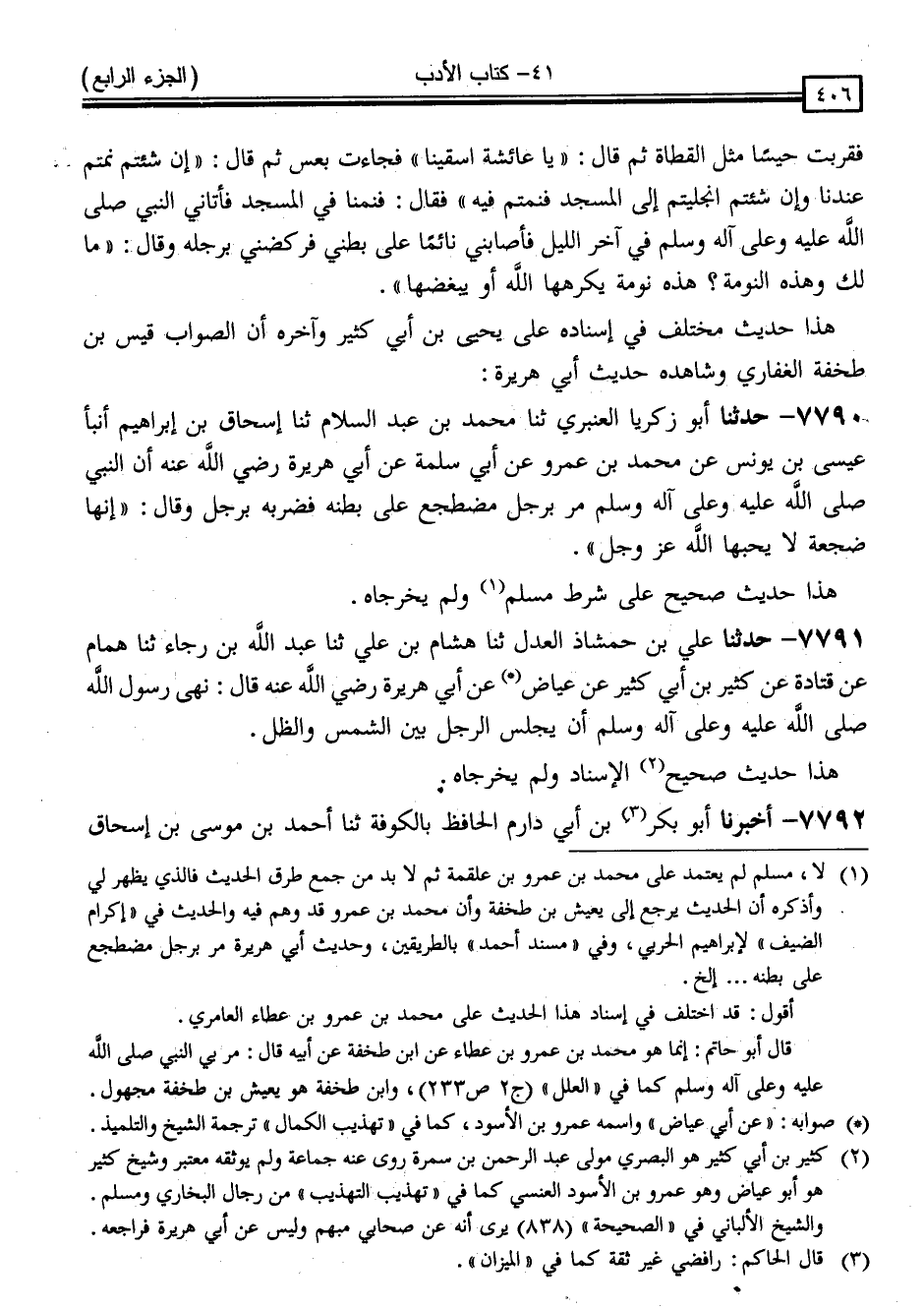 7790 - حَدَّثَنَا أَبُو زَكَرِيَّا الْعَنْبَرِيُّ ، ثَنَا مُحَمَّدُ بْنُ عَبْدِ السَّلَامِ ، ثَنَا إِسْحَاقُ بْنُ إِبْرَاهِيمَ ، أَنْبَأَ عِيسَى بْنُ يُونُسَ ، عَنْ مُحَمَّدِ بْنِ عَمْرٍو ، عَنْ أَبِي سَلَمَةَ ، عَنْ أَبِي هُرَيْرَةَ ، رَضِيَ اللَّهُ عَنْهُ أَنَّ النَّبِيَّ صَلَّى اللَّهُ عَلَيْهِ وَسَلَّمَ مَرَّ بِرَجُلٍ مُضْطَجِعٍ عَلَى بَطْنِهِ فَضَرَبَهُ بِرِجْلِهِ وَقَالَ: " إِنَّهَا ضِجْعَةٌ لَا يُحِبُّهَا اللَّهُ عَزَّ وَجَلَّ "