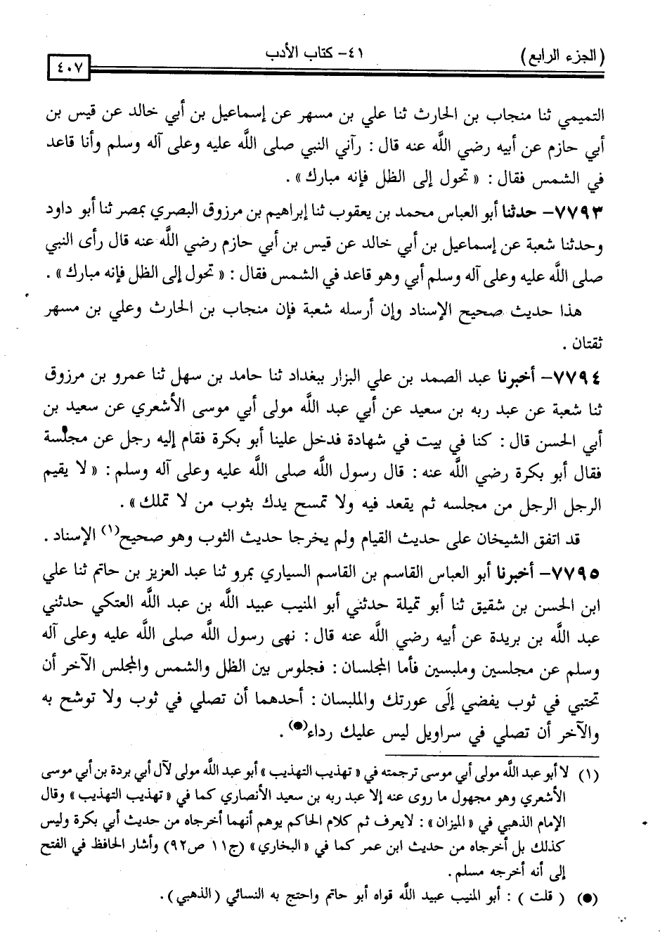 7793 - حَدَّثَنَا أَبُو الْعَبَّاسِ مُحَمَّدُ بْنُ يَعْقُوبَ ، ثَنَا إِبْرَاهِيمُ بْنُ مَرْزُوقٍ الْبَصْرِيُّ ، بِمِصْرَ ، ثَنَا أَبُو دَاوُدَ ، وَحَدَّثَنَا شُعْبَةُ ، عَنْ إِسْمَاعِيلَ بْنِ أَبِي خَالِدٍ ، عَنْ قَيْسِ بْنِ أَبِي حَازِمٍ ، رَضِيَ اللَّهُ عَنْهُ قَالَ: رَأَى النَّبِيُّ صَلَّى اللَّهُ عَلَيْهِ وَسَلَّمَ أَبِي وَهُوَ قَاعِدٌ فِي الشَّمْسِ ، فَقَالَ: " تَحَوَّلْ إِلَى الظِّلِّ فَإِنَّهُ مُبَارَكٌ "