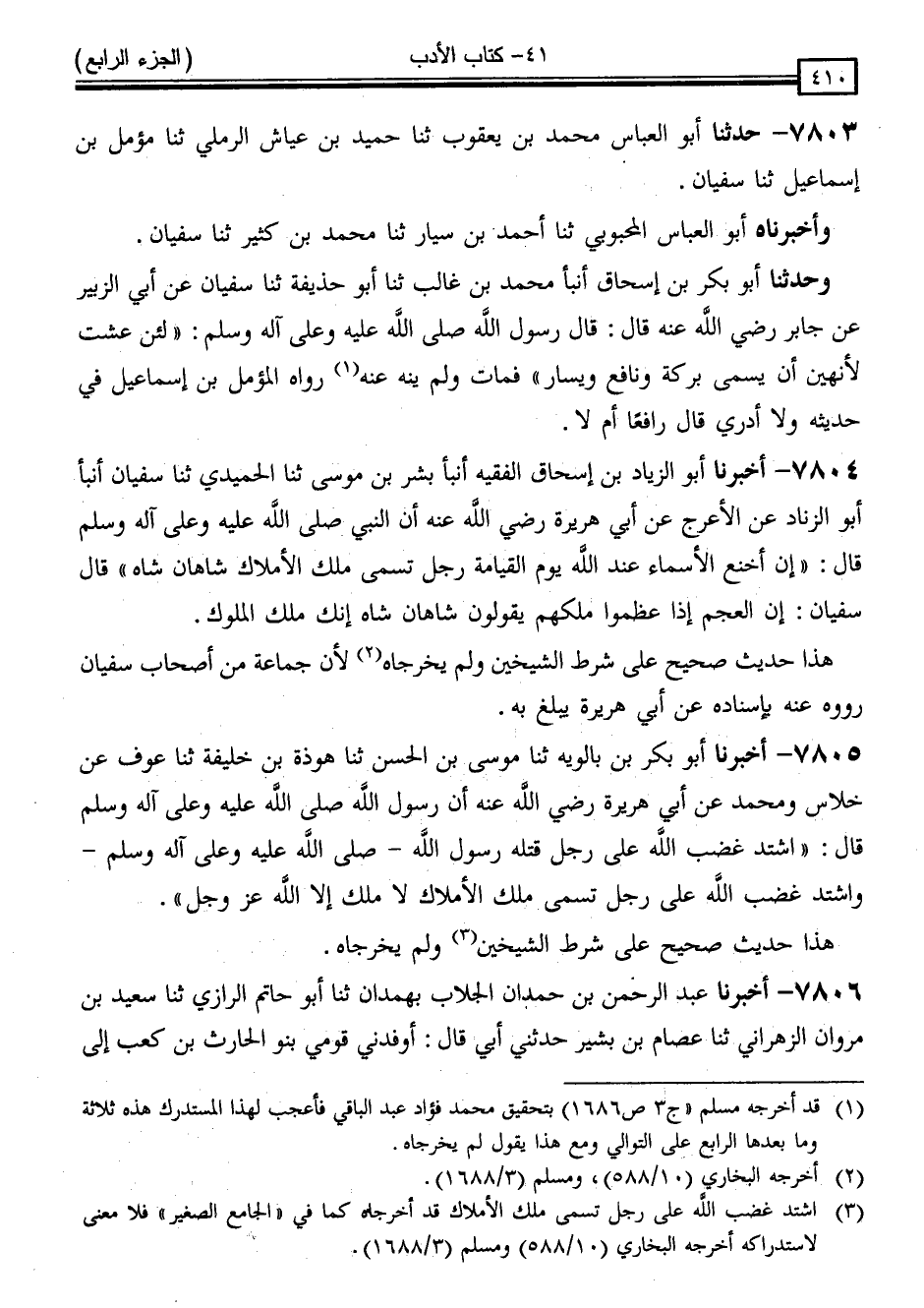 7804 - أَخْبَرَنَا أَبُو الزَّيَّادِ * بْنُ إِسْحَاقَ الْفَقِيهُ ، أَنْبَأَ بِشْرُ بْنُ مُوسَى ، ثَنَا الْحُمَيْدِيُّ ، ثَنَا سُفْيَانُ ، أَنْبَأَ أَبُو الزِّنَادِ ، عَنِ الْأَعْرَجِ ، عَنْ أَبِي هُرَيْرَةَ ، رَضِيَ اللَّهُ عَنْهُ أَنَّ النَّبِيَّ صَلَّى اللَّهُ عَلَيْهِ وَسَلَّمَ قَالَ: " إِنَّ أَخْنَعَ الْأَسْمَاءِ عِنْدَ اللَّهِ يَوْمَ الْقِيَامَةِ رَجُلٌ تَسَمَّى مَلِكَ الْأَمْلَاكِ شَاهَانْ شَاهْ " قَالَ سُفْيَانُ: " إِنَّ الْعَجَمَ إِذَا عَظَّمُوا مَلِكَهُمْ يَقُولُونَ شَاهَانْ شَاهْ: إِنَّكَ مَلِكُ الْمُلُوكِ "
