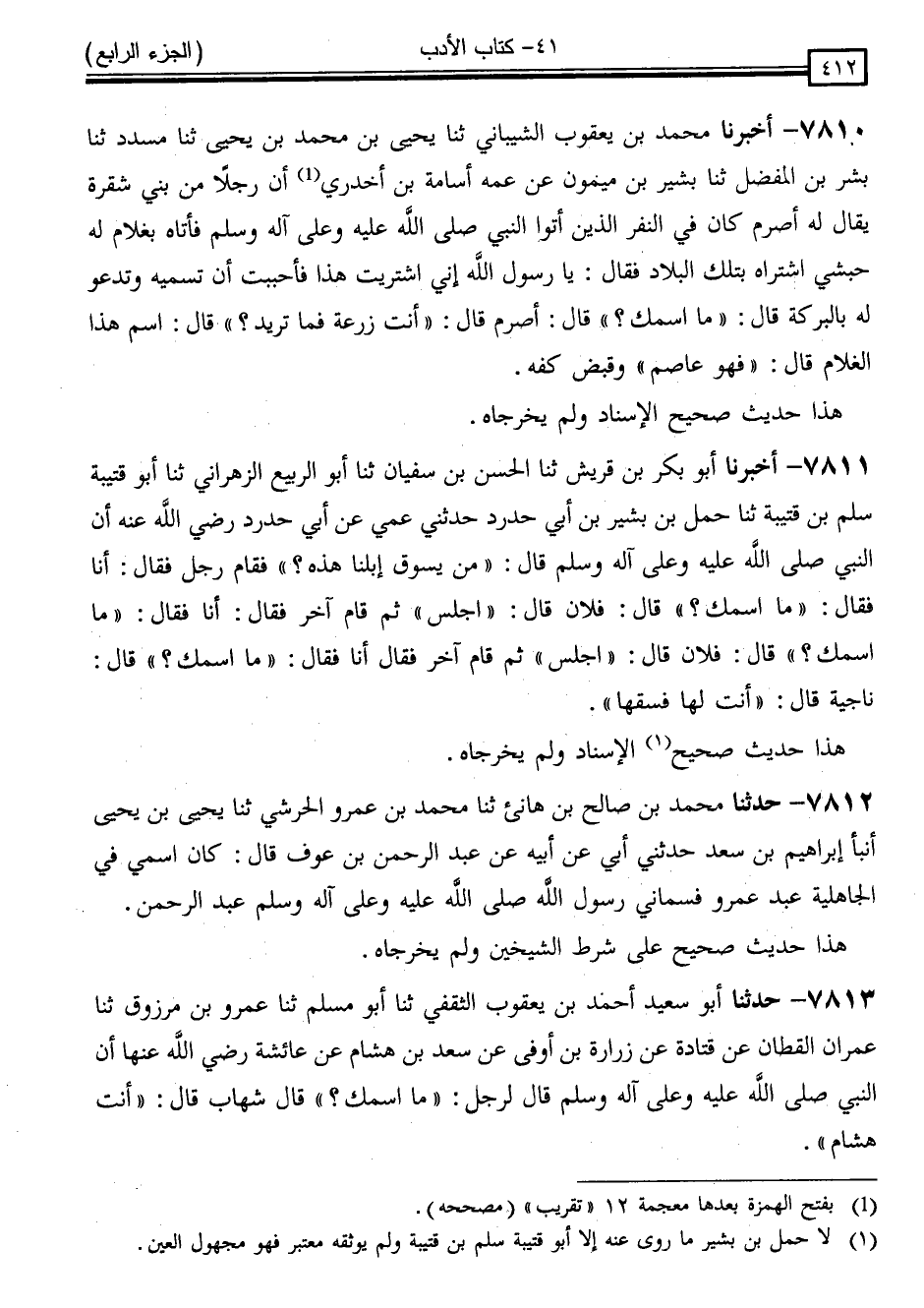 7810 - أَخْبَرَنَا مُحَمَّدُ بْنُ يَعْقُوبَ الشَّيْبَانِيُّ ، ثَنَا يَحْيَى بْنُ مُحَمَّدِ بْنِ يَحْيَى ، ثَنَا مُسَدَّدٌ ، ثَنَا بِشْرُ بْنُ الْمُفَضَّلِ ، ثَنَا بَشِيرُ بْنُ مَيْمُونٍ ، عَنْ عَمِّهِ أُسَامَةَ بْنِ أَخْدَرِيٍّ ، أَنَّ رَجُلًا مِنْ بَنِي شَقِرَةَ يُقَالُ لَهُ: أَصْرَمُ كَانَ فِي النَّفَرِ الَّذِينَ أَتَوُا النَّبِيَّ صَلَّى اللَّهُ عَلَيْهِ وَسَلَّمَ فَأَتَاهُ بِغُلَامٍ لَهُ حَبَشِيٍّ اشْتَرَاهُ بِتِلْكَ الْبِلَادِ فَقَالَ: يَا رَسُولَ اللَّهِ ، إِنِّي اشْتَرَيْتُ هَذَا فَأَحْبَبْتُ أَنْ تُسَمِّيَهُ وَتَدْعُوَ لَهُ بِالْبَرَكَةِ . قَالَ: " مَا اسْمُكَ " قَالَ: أَصْرَمُ ، قَالَ: " أَنْتَ زُرْعَةَ فَمَا تُرِيدُ ؟ " قَالَ: اسْمَ هَذَا الْغُلَامِ . قَالَ: " فَهُوَ عَاصِمٌ " وَقَبَضَ كَفَّهُ