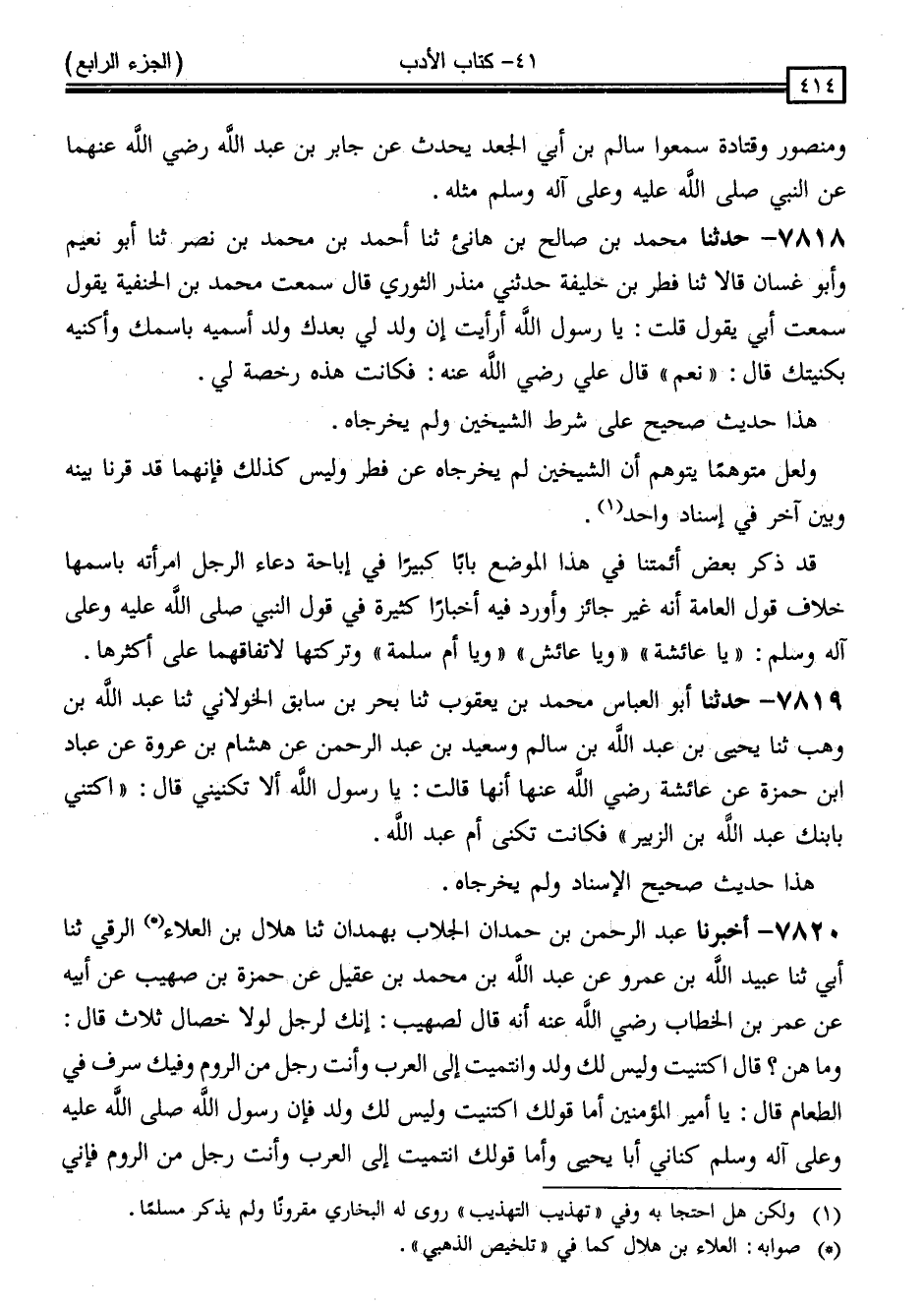 7820 - أَخْبَرَنَا عَبْدُ الرَّحْمَنِ بْنُ حَمْدَانَ الْجَلَّابُ ، بِهَمْدَانَ ، ثَنَا هِلَالُ بْنُ الْعَلَاءِ الرَّقِّيُّ ، ثَنَا أَبِي ، ثَنَا عُبَيْدُ اللَّهِ بْنُ عَمْرٍو ، عَنْ عَبْدِ اللَّهِ بْنِ مُحَمَّدِ بْنِ عَقِيلٍ ، عَنْ حَمْزَةَ بْنِ صُهَيْبٍ ، عَنْ أَبِيهِ ، عَنْ عُمَرَ بْنِ الْخَطَّابِ رَضِيَ اللَّهُ عَنْهُ أَنَّهُ قَالَ لِصُهَيْبٍ: إِنَّكَ لَرَجُلٌ لَوْلَا خِصَالٌ ثَلَاثَةٌ ، قَالَ: وَمَا هُنَّ ؟ قَالَ: اكْتَنَيْتَ وَلَيْسَ لَكَ وَلَدٌ ، وَانْتَمَيْتَ إِلَى الْعَرَبِ وَأَنْتَ رَجُلٌ مِنَ الرُّومِ ، وَفِيكَ سَرَفٌ فِي الطَّعَامِ . قَالَ: يَا أَمِيرَ الْمُؤْمِنِينَ ، أَمَّا قَوْلُكَ: اكْتَنَيْتَ وَلَيْسَ لَكَ وَلَدٌ فَإِنَّ رَسُولَ اللَّهِ صَلَّى اللَّهُ عَلَيْهِ وَسَلَّمَ كَنَّانِي أَبَا يَحْيَى ، وَأَمَّا قَوْلُكُ: انْتَمَيْتَ إِلَى الْعَرَبِ وَأَنْتَ رَجُلٌ مِنَ الرُّومِ فَإِنِّي -[415]- رَجُلٌ مِنَ النَّمِرِ بْنِ قَاسِطٍ اسْتُبِيتُ مِنَ الْمَوْصِلِ بَعْدَ أَنْ كُنْتُ غُلَامًا قَدْ عَرَفْتُ أَهْلِي وَنَسَبِي ، وَأَمَّا قَوْلُكَ: فِيكَ سَرَفٌ فِي الطَّعَامِ فَإِنِّي سَمِعْتُ رَسُولَ اللَّهِ صَلَّى اللَّهُ عَلَيْهِ وَسَلَّمَ يَقُولُ: " إِنَّ خَيْرَكُمْ مَنْ أَطْعَمَ الطَّعَامَ "