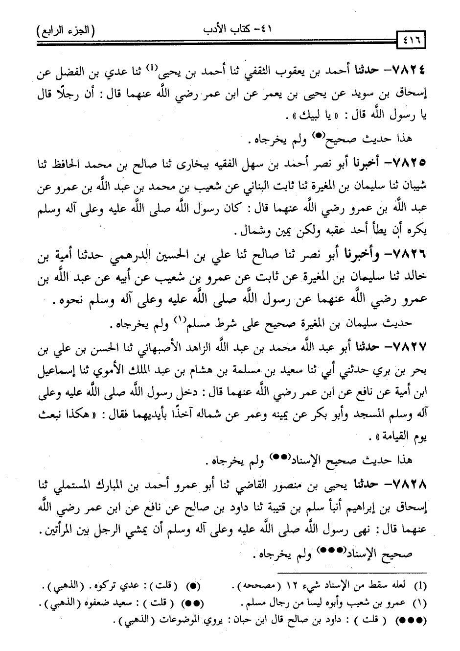 7825 - أَخْبَرَنَا أَبُو نَصْرٍ أَحْمَدُ بْنُ سَهْلٍ الْفَقِيهُ بِبُخَارَى ، ثَنَا صَالِحُ بْنُ مُحَمَّدٍ الْحَافِظُ ، ثَنَا شَيْبَانُ ، ثَنَا سُلَيْمَانُ بْنُ الْمُغِيرَةِ ، ثَنَا ثَابِتٌ الْبُنَانِيُّ ، عَنْ شُعَيْبِ بْنِ مُحَمَّدِ بْنِ عَبْدِ اللَّهِ بْنِ عَمْرٍو ، عَنْ عَبْدِ اللَّهِ بْنِ عَمْرٍو ، رَضِيَ اللَّهُ عَنْهُمَا قَالَ: " كَانَ رَسُولُ اللَّهِ صَلَّى اللَّهُ عَلَيْهِ وَسَلَّمَ يَكْرَهُ أَنْ يَطَأَ أَحَدٌ عَقِبَهُ وَلَكِنْ يَمِينٌ وَشِمَالٌ "