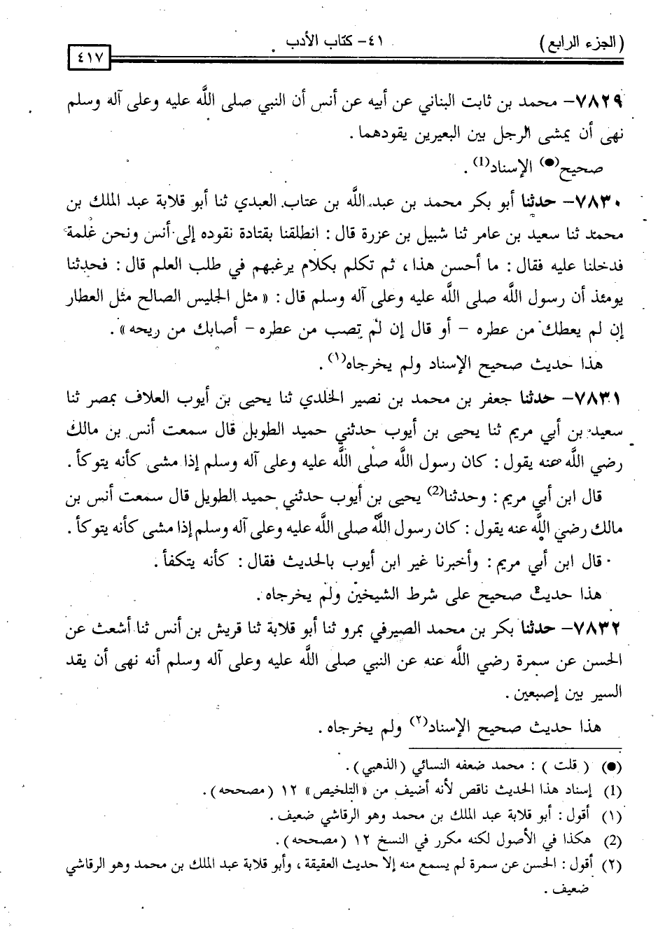 7829 - [أَخْبَرَنَا الْحَسَنُ بْنُ يَعْقُوبَ الْعَدْلُ، ثَنَا السَّرِيُّ بْنُ خُزَيْمَةَ ، ثَنَا مُطَهَّرُ بْنُ الْهَيْثَمِ ، ثَنَا] مُحَمَّدُ بْنُ ثَابِتٍ الْبُنَانِيُّ ، عَنْ أَبِيهِ ، عَنْ أَنَسٍ " أَنَّ النَّبِيَّ صَلَّى اللَّهُ عَلَيْهِ وَسَلَّمَ نَهَى أَنْ يَمْشِيَ الرَّجُلُ بَيْنَ الْبَعِيرَيْنِ يَقُودُهُمَا "
