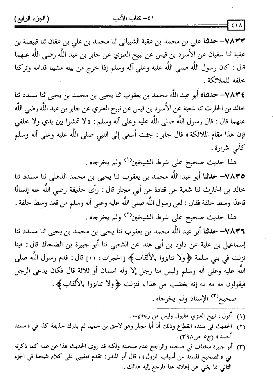 7836 - حَدَّثَنَا أَبُو عَبْدِ اللَّهِ مُحَمَّدُ بْنُ يَعْقُوبَ ، ثَنَا يَحْيَى بْنُ مُحَمَّدِ بْنِ يَحْيَى ، ثَنَا مُسَدَّدٌ ، ثَنَا إِسْمَاعِيلُ ابْنُ عُلَيَّةَ ، عَنْ دَاوُدَ بْنِ أَبِي هِنْدٍ ، عَنِ الشَّعْبِيِّ ، ثَنَا أَبُو جَبِيرَةَ بْنُ الضَّحَّاكِ ، قَالَ: فِينَا نَزَلَتْ فِي بَنِي سَلِمَةَ { وَلَا تَنَابَزُوا بِالْأَلْقَابِ } [الحجرات: 11] قَالَ: " قَدِمَ رَسُولُ اللَّهِ صَلَّى اللَّهُ عَلَيْهِ وَسَلَّمَ وَلَيْسَ مِنَّا رَجُلٌ إِلَّا وَلَهُ اسْمَانِ أَوْ ثَلَاثَةٌ " قَالَ: " فَكَانَ يُدْعَى الرَّجُلُ فَيَقُولُونَ مَهْ مَهْ مَهْ إِنَّهُ يَغْضَبُ مِنْ هَذَا " فَنَزَلَتْ: { وَلَا تَنَابَزُوا بِالْأَلْقَابِ } [الحجرات: 11]