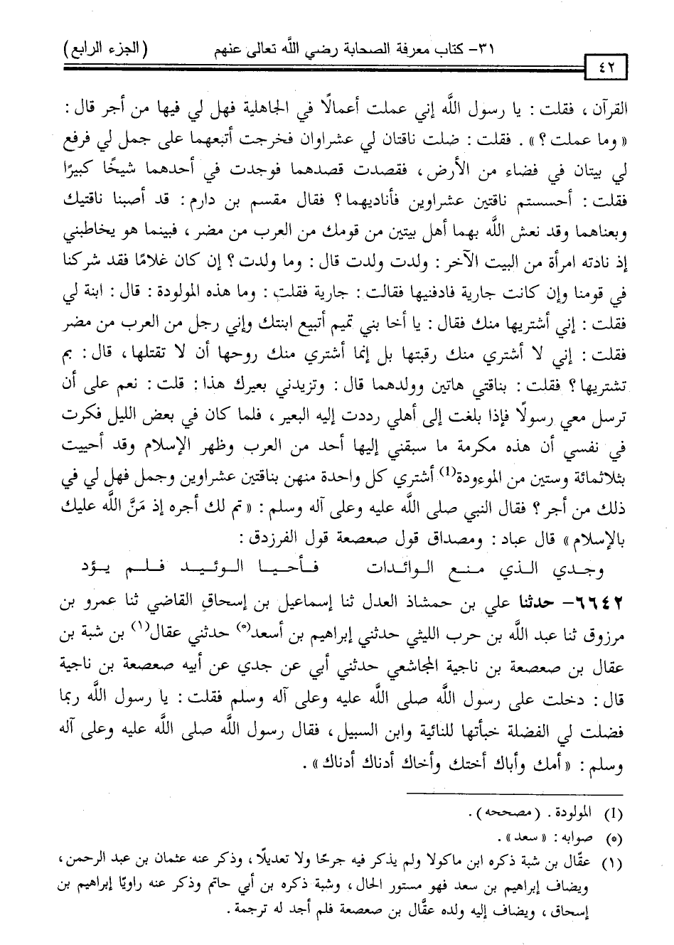 6642 - حَدَّثَنَا عَلِيُّ بْنُ حَمْشَاذٍ الْعَدْلُ ، ثَنَا إِسْمَاعِيلُ بْنُ إِسْحَاقَ الْقَاضِي ، ثَنَا عَمْرُو بْنُ مَرْزُوقٍ ، ثَنَا عَبْدُ اللَّهِ بْنُ حَرْبٍ اللَّيْثِيُّ ، حَدَّثَنِي إِبْرَاهِيمُ بْنُ أَسْعَدَ ، حَدَّثَنِي عِقَالُ بْنُ شَبَّةَ بْنِ عِقَالِ بْنِ صَعْصَعَةَ بْنِ نَاجِيَةَ الْمُجَاشِعِيِّ ، حَدَّثَنِي أَبِي ، عَنْ جَدِّي ، عَنْ أَبِيهِ صَعْصَعَةَ بْنِ نَاجِيَةَ ، قَالَ: دَخَلْتُ عَلَى رَسُولِ اللَّهِ صَلَّى اللَّهُ عَلَيْهِ وَسَلَّمَ فَقُلْتُ: يَا رَسُولَ اللَّهِ رُبَّمَا فَضَلَتْ لِي الْفَضْلَةُ خَبَّأْتُهَا لِلنَّائِيَةِ ، وَابْنِ السَّبِيلِ ، فَقَالَ رَسُولُ اللَّهِ صَلَّى اللَّهُ عَلَيْهِ وَسَلَّمَ: " أُمَّكَ وَأَبَاكَ ، أُخْتَكَ وَأَخَاكَ ، أَدْنَاكَ أَدْنَاكَ "