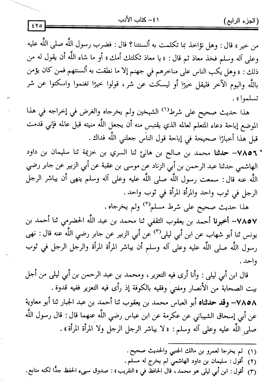 7856 - حَدَّثَنَا مُحَمَّدُ بْنُ صَالِحِ بْنِ هَانِئٍ ، ثَنَا السَّرِيُّ بْنُ خُزَيْمَةَ ، ثَنَا سُلَيْمَانُ بْنُ دَاوُدَ الْهَاشِمِيُّ ، حَدَّثَنَا عَبْدُ الرَّحْمَنِ بْنُ أَبِي الزِّنَادِ ، عَنْ مُوسَى بْنِ عُقْبَةَ ، عَنْ أَبِي الزُّبَيْرِ ، عَنْ جَابِرٍ ، رَضِيَ اللَّهُ عَنْهُ قَالَ: سَمِعْتُ رَسُولَ اللَّهِ صَلَّى اللَّهُ عَلَيْهِ وَسَلَّمَ: " يَنْهَى أَنْ يُبَاشِرَ الرَّجُلُ الرَّجُلَ فِي ثَوْبٍ وَاحِدٍ وَالْمَرْأَةُ الْمَرْأَةُ فِي ثَوْبٍ وَاحِدٍ "