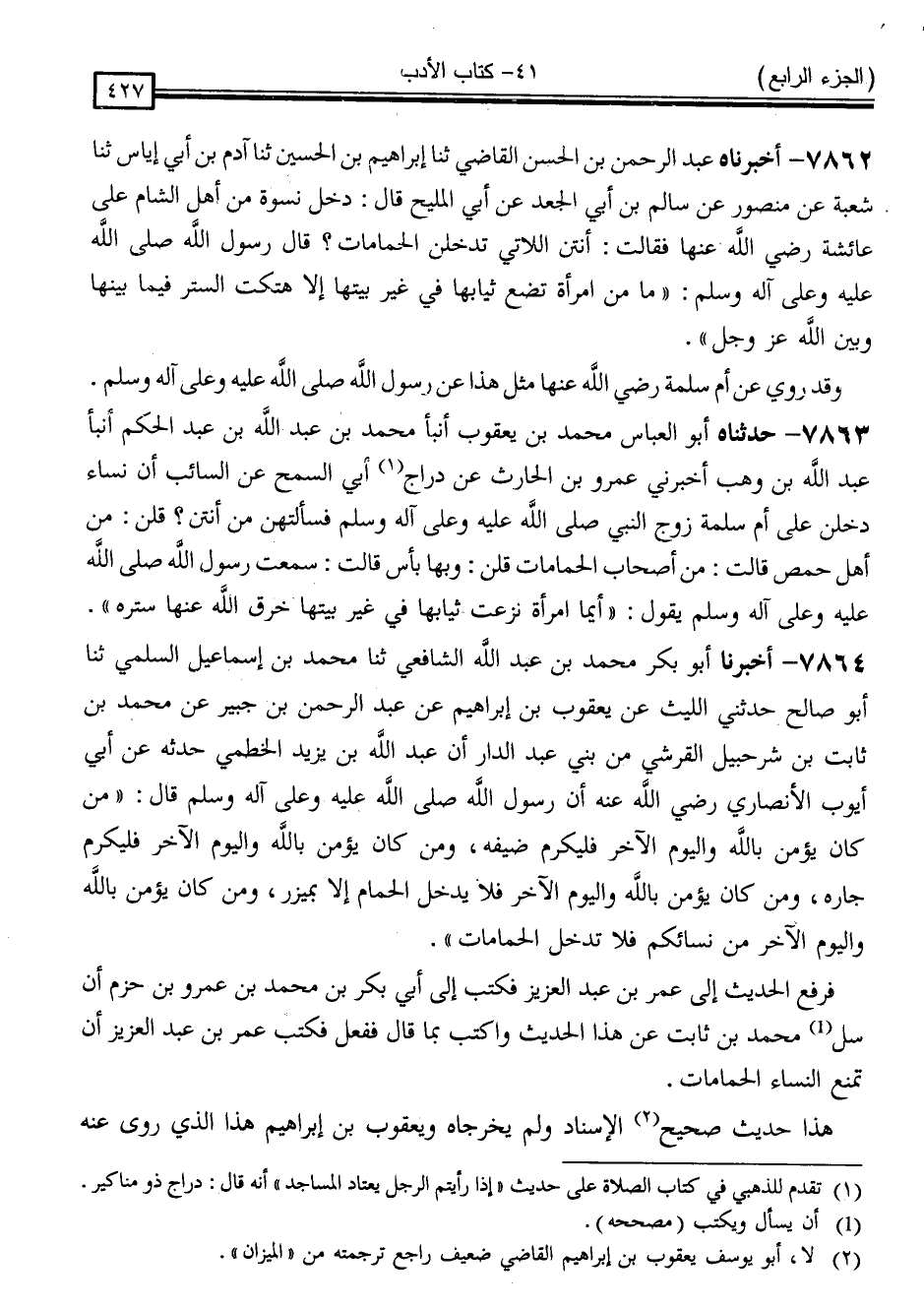 7864 - أَخْبَرَنَا أَبُو بَكْرٍ مُحَمَّدُ بْنُ عَبْدِ اللَّهِ الشَّافِعِيُّ ، ثَنَا مُحَمَّدُ بْنُ إِسْمَاعِيلَ السُّلَمِيُّ ، ثَنَا أَبُو صَالِحٍ ، حَدَّثَنِي اللَّيْثُ ، عَنْ يَعْقُوبَ بْنِ إِبْرَاهِيمَ ، عَنْ عَبْدِ الرَّحْمَنِ بْنِ جُبَيْرٍ ، عَنْ مُحَمَّدِ بْنِ ثَابِتِ بْنِ شُرَحْبِيلَ الْقُرَشِيِّ ، مِنْ بَنِي عَبْدِ الدَّارِ أَنَّ عَبْدَ اللَّهِ بْنَ يَزِيدَ الْخَطْمِيَّ ، حَدَّثَهُ عَنْ أَبِي أَيُّوبَ الْأَنْصَارِيِّ ، رَضِيَ اللَّهُ عَنْهُ أَنَّ رَسُولَ اللَّهِ صَلَّى اللَّهُ عَلَيْهِ وَسَلَّمَ قَالَ: " مَنْ كَانَ يُؤْمِنُ بِاللَّهِ وَالْيَوْمِ الْآخِرِ فَلْيُكْرِمْ ضَيْفَهُ ، وَمَنْ كَانَ يُؤْمِنُ بِاللَّهِ وَالْيَوْمِ الْآخِرِ فَلْيُكْرِمْ جَارَهُ ، وَمَنْ كَانَ يُؤْمِنُ بِاللَّهِ وَالْيَوْمِ الْآخِرِ فَلَا يَدْخُلِ الْحَمَّامَ إِلَّا بِمِئْزَرٍ ، وَمَنْ كَانَ يُؤْمِنُ بِاللَّهِ وَالْيَوْمِ الْآخِرِ مِنْ نِسَائِكُمْ فَلَا تَدْخُلِ الْحَمَّامَاتِ "