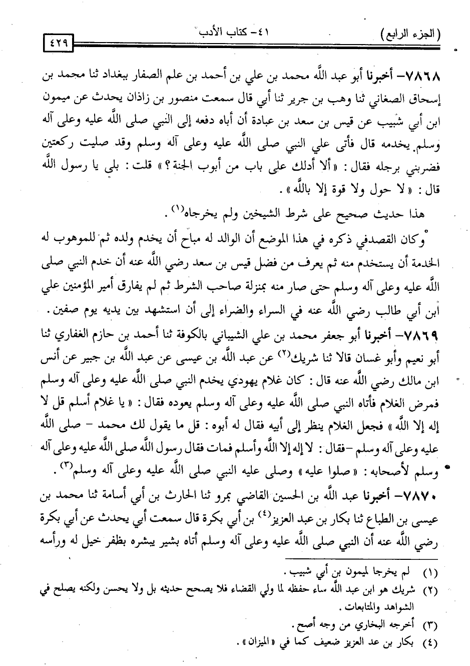 7868 - أَخْبَرَنَا أَبُو عَبْدِ اللَّهِ مُحَمَّدُ بْنُ عَلِيِّ بْنِ أَحْمَدَ بْنِ عَلَمُ الصَّفَّارُ ، بِبَغْدَادَ ، ثَنَا مُحَمَّدُ بْنُ إِسْحَاقَ الصَّغَانِيُّ ، ثَنَا وَهْبُ بْنُ جَرِيرٍ ، ثَنَا أَبِي ، قَالَ: سَمِعْتُ مَنْصُورَ بْنَ زَاذَانَ ، يُحَدِّثُ عَنْ مَيْمُونِ بْنِ أَبِي شَبِيبٍ ، عَنْ قَيْسِ بْنِ سَعْدِ بْنِ عُبَادَةَ ، أَنَّ أَبَاهُ دَفَعَهُ إِلَى النَّبِيِّ صَلَّى اللَّهُ عَلَيْهِ وَسَلَّمَ يَخْدُمُهُ قَالَ: فَأَتَى عَلَيَّ النَّبِيُّ صَلَّى اللَّهُ عَلَيْهِ وَسَلَّمَ وَقَدْ صَلَّيْتُ رَكْعَتَيْنِ فَضَرَبَنِي بِرِجْلِهِ فَقَالَ: " أَلَا أَدُلُّكَ عَلَى بَابٍ مِنْ أَبْوَابِ الْجَنَّةِ ؟ " قُلْتُ: بَلَى يَا رَسُولَ اللَّهِ ، قَالَ: " لَا حَوْلَ وَلَا قُوَّةَ إِلَّا بِاللَّهِ "
