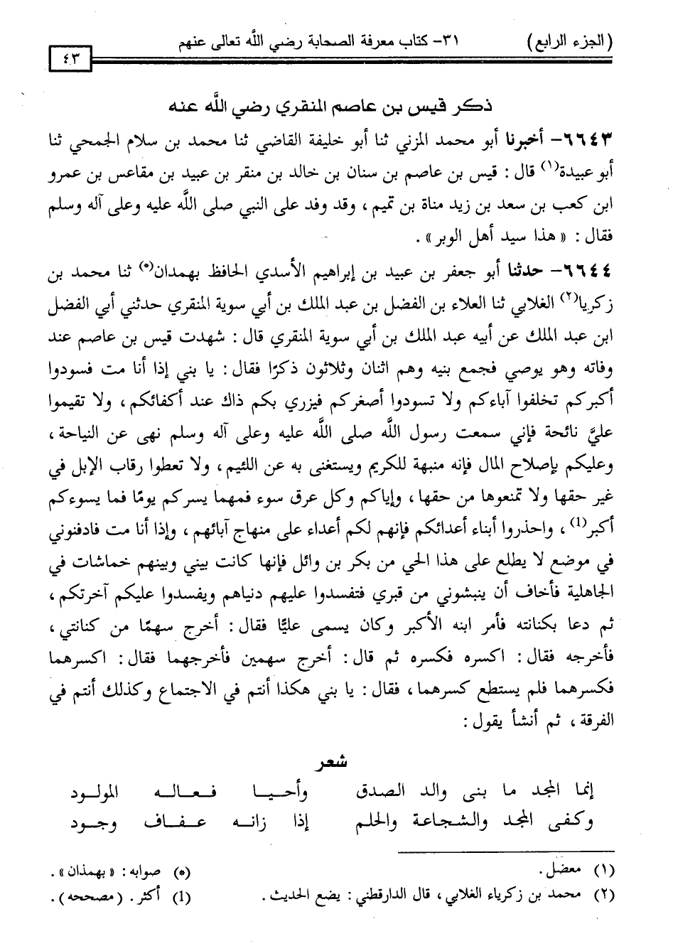 6644 - حَدَّثَنَا أَبُو جَعْفَرٍ أَحْمَدُ بْنُ عُبَيْدِ بْنِ إِبْرَاهِيمَ الْأَسَدِيُّ الْحَافِظُ بِهَمْدَانَ ، ثَنَا مُحَمَّدُ بْنُ زَكَرِيَّا الْغَلَابِيُّ ، ثَنَا الْعَلَاءُ بْنُ الْفَضْلِ بْنِ عَبْدِ الْمَلِكِ بْنِ أَبِي سَوِيَّةَ الْمِنْقَرِيُّ ، حَدَّثَنِي أَبِي الْفَضْلُ بْنُ عَبْدِ الْمَلِكِ ، عَنْ أَبِيهِ عَبْدِ الْمَلِكِ بْنِ أَبِي سَوِيَّةَ الْمِنْقَرِيِّ ، قَالَ: شَهِدْتُ قَيْسَ بْنَ عَاصِمٍ عِنْدَ وَفَاتِهِ وَهُوَ يُوصِي فَجَمَعَ بَنِيهِ وَهُمُ اثْنَانِ وَثَلَاثُونَ ذَكَرًا ، فَقَالَ: يَا بَنِيَّ إِذَا أَنَا مُتُّ فَسَوِّدُوا أَكْبَرَكُمْ تَخْلُفُوا آبَاءَكُمْ ، وَلَا تُسَوِّدُوا أَصْغَرَكُمْ فَيَزْرِي بِكُمْ ذَاكَ عِنْدَ أَكْفَائِكُمْ وَلَا تُقِيمُوا عَلَيَّ نَائِحَةً ، فَإِنِّي سَمِعْتُ رَسُولَ اللَّهِ صَلَّى اللَّهُ عَلَيْهِ وَسَلَّمَ " نَهَى عَنِ النِّيَاحَةِ " ، وَعَلَيْكُمْ بِإْصْلَاحِ الْمَالِ ، فَإِنَّهُ مَنْبَهَةٌ لِلْكَرِيمِ وَيُسْتَغْنَى بِهِ عَنِ اللَّئِيمِ ، وَلَا تُعْطُوا رِقَابَ الْإِبِلِ فِي غَيْرِ حَقِّهَا ، وَلَا تَمْنَعُوهَا مِنْ حَقِّهَا ، وَإِيَّاكُمْ وَكُلَّ عِرْقِ سُوءٍ فَمَهْمَا يَسُرُّكُمْ يَوْمًا ، فَمَا يَسُوءُكُمْ أَكْبَرُ وَاحْذَرُوا أَبْنَاءَ أَعْدَائِكُمْ ، فَإِنَّهُمْ لَكُمْ أَعْدَاءٌ عَلَى مِنْهَاجِ آبَائِهِمْ ، وَإِذَا أَنَا مُتُّ فَادْفِنُونِي فِي مَوْضِعٍ لَا يَطَّلِعُ عَلَى هَذَا الْحَيِّ مِنْ بَكْرِ بْنِ وَائِلٍ فَإِنَّهَا كَانَتْ بَيْنِي وَبَيْنَهُمْ خَمَاشَاتٌ فِي الْجَاهِلِيَّةِ ، فَأَخَافُ أَنْ يَنْبِشُونِي مِنْ قَبْرِي فَتُفْسِدُوا عَلَيْهِمْ دُنْيَاهُمْ وَيَفْسِدُوا عَلَيْكُمْ آخِرَتَكُمْ ، ثُمَّ دَعَا بِكِنَانَتِهِ فَأَمَرَ ابْنَهُ الْأَكْبَرَ ، وَكَانَ يُسَمَّى عَلِيًّا ، فَقَالَ: أَخْرِجْ سَهْمًا مِنْ كِنَانَتِي فَأَخْرَجَهُ ، فَقَالَ: اكْسَرْهُ فَكَسَرَهُ ، ثُمَّ قَالَ: أَخْرِجْ سَهْمَيْنِ فَأَخْرَجَهُمَا ، فَقَالَ: اكْسَرْهُمَا فَكَسَرَهُمَا فَلَمْ يَسْتَطِعْ كَسْرَهُمَا ، فَقَالَ: " يَا بُنَيَّ هَكَذَا أَنْتُمْ فِي الِاجْتِمَاعِ ، وَكَذَلِكَ أَنْتُمْ فِي الْفُرْقَةِ " ، ثُمَّ أَنْشَأَ ، يَقُولُ: