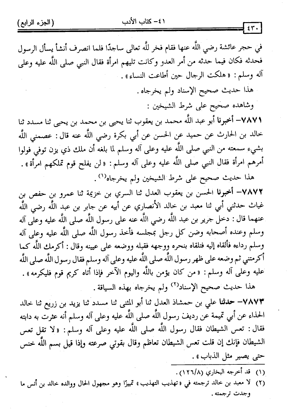 7871 - أَخْبَرَنَا أَبُو عَبْدِ اللَّهِ مُحَمَّدُ بْنُ يَعْقُوبَ ، ثَنَا يَحْيَى بْنُ مُحَمَّدِ بْنِ يَحْيَى ، ثَنَا مُسَدَّدٌ ، ثَنَا خَالِدُ بْنُ الْحَارِثِ ، عَنْ حُمَيْدٍ ، عَنِ الْحَسَنِ ، عَنْ أَبِي بَكْرَةَ ، رَضِيَ اللَّهُ عَنْهُ قَالَ: عَصَمَنِي اللَّهُ بِشَيْءٍ سَمِعْتُهُ مِنَ النَّبِيِّ صَلَّى اللَّهُ عَلَيْهِ وَسَلَّمَ لَمَّا بَلَغَهُ أَنَّ مَلِكَ ذِي يَزَنٍ تُوُفِّيَ فَوَلَّوْا أَمَرَهُمُ امْرَأَةً فَقَالَ النَّبِيُّ صَلَّى اللَّهُ عَلَيْهِ وَسَلَّمَ: " لَنْ يُفْلِحَ قَوْمٌ تَمْلِكُهُمُ امْرَأَةٌ "