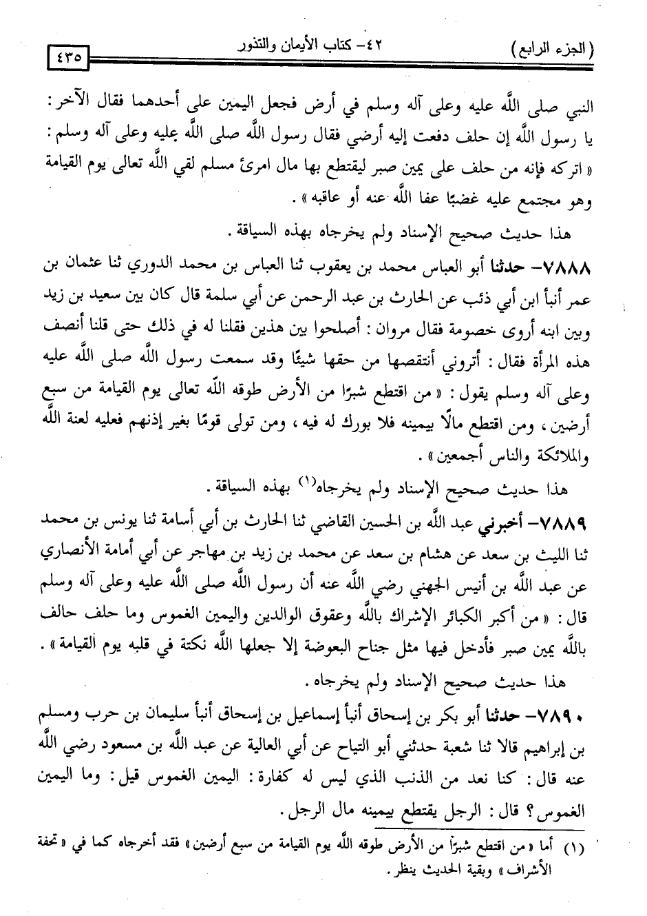 7888 - حَدَّثَنَا أَبُو الْعَبَّاسِ مُحَمَّدُ بْنُ يَعْقُوبَ ، ثَنَا الْعَبَّاسُ بْنُ مُحَمَّدٍ الدُّورِيُّ ، ثَنَا عُثْمَانُ بْنُ عُمَرَ ، أَنْبَأَ ابْنُ أَبِي ذِئْبٍ ، عَنِ الْحَارِثِ بْنِ عَبْدِ الرَّحْمَنِ ، عَنْ أَبِي سَلَمَةَ ، قَالَ: كَانَ بَيْنَ سَعِيدِ بْنِ زَيْدٍ ، وَبَيْنَ ابْنَةِ أَرْوَى خُصُومَةٌ ، فَقَالَ مَرْوَانُ: أَصْلِحُوا بَيْنَ هَذَيْنِ ، فَقُلْنَا لَهُ فِي ذَلِكَ حَتَّى قُلْنَا أَنْصَفَ هَذِهِ الْمَرْأَةَ ، فَقَالَ: أَتُرَوْنِي أَنْتَقِصُهَا مِنْ حَقِّهَا شَيْئًا ، وَقَدْ سَمِعْتُ رَسُولَ اللَّهِ صَلَّى اللَّهُ عَلَيْهِ وَسَلَّمَ يَقُولُ: " مَنِ اقْتَطَعَ شِبْرًا مِنَ الْأَرْضِ طُوَّقَهُ اللَّهُ تَعَالَى يَوْمَ الْقِيَامَةِ مِنْ سَبْعِ أَرَضِينَ ، وَمَنِ اقْتَطَعَ مَالًا بِيَمِينِهِ فَلَا بُورِكَ لَهُ فِيهِ ، وَمَنْ تَوَلَّى قَوْمًا بِغَيْرِ إِذْنِهِمْ فَعَلَيْهِ لَعْنَةُ اللَّهِ وَالْمَلَائِكَةِ وَالنَّاسِ أَجْمَعِينَ "