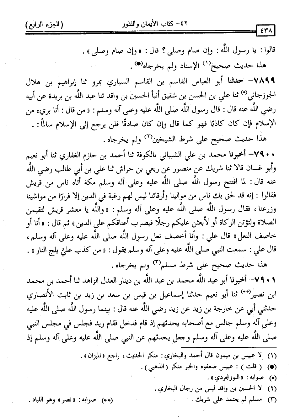 7899 - حَدَّثَنَا أَبُو الْعَبَّاسِ قَاسِمُ بْنُ الْقَاسِمِ السَّيَّارِيُّ ، بِمَرْوَ ، ثَنَا إِبْرَاهِيمُ بْنُ هِلَالٍ الْجَوْزَجَانِيُّ * ، ثَنَا عَلِيُّ بْنُ الْحَسَنِ بْنِ شَقِيقٍ ، أَنْبَأَ الْحُسَيْنُ بْنُ وَاقِدٍ ، ثَنَا عَبْدُ اللَّهِ بْنُ بُرَيْدَةَ ، عَنْ أَبِيهِ ، رَضِيَ اللَّهُ عَنْهُ قَالَ: قَالَ رَسُولُ اللَّهِ صَلَّى اللَّهُ عَلَيْهِ وَسَلَّمَ: " مَنْ قَالَ أَنَا بَرِيءٌ مِنَ الْإِسْلَامِ فَإِنْ كَانَ كَاذِبًا فَهُوَ كَمَا قَالَ وَإِنْ كَانَ صَادِقًا فَلَنْ يَرْجِعَ إِلَى الْإِسْلَامِ سَالِمًا "