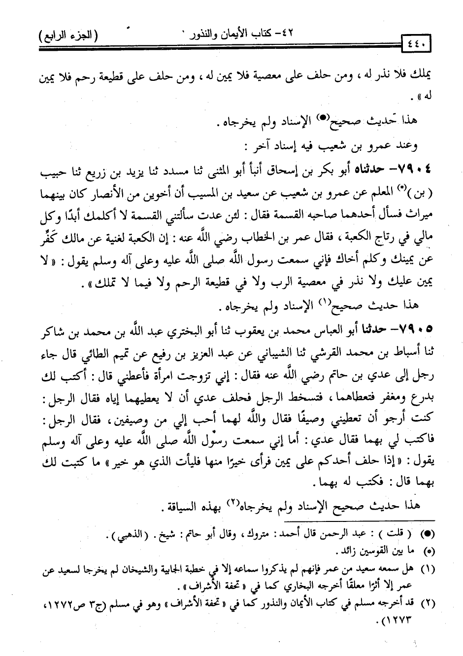 7904 - حَدَّثَنَاهُ أَبُو بَكْرِ بْنُ إِسْحَاقَ ، أَنْبَأَ أَبُو الْمُثَنَّى ، ثَنَا مُسَدَّدٌ ، ثَنَا يَزِيدُ بْنُ زُرَيْعٍ ، ثَنَا حَبِيبُ (بْنُ) الْمُعَلِّمِ ، عَنْ عَمْرِو بْنِ شُعَيْبٍ ، عَنْ سَعِيدِ بْنِ الْمُسَيَّبِ ، أَنَّ أَخَوَيْنِ مِنَ الْأَنْصَارِ كَانَ بَيْنَهُمَا مِيرَاثٌ فَسَأَلَ أَحَدُهُمَا صَاحِبَهُ الْقِسْمَةَ فَقَالَ: لَئِنْ عُدْتَ سَأَلْتَنِي الْقِسْمَةَ لَا أُكَلِّمُكَ أَبَدًا وَكُلُّ مَالِي فِي رِتَاجِ الْكَعْبَةِ فَقَالَ عُمَرُ بْنُ الْخَطَّابِ رَضِيَ اللَّهُ عَنْهُ: إِنَّ الْكَعْبَةَ لَغَنِيَّةٌ عَنْ مَالِكَ ، كَفِّرْ عَنْ يَمِينِكَ وَكَلِّمْ أَخَاكَ فَإِنِّي سَمِعْتُ رَسُولَ اللَّهِ صَلَّى اللَّهُ عَلَيْهِ وَسَلَّمَ يَقُولُ: " لَا يَمِينَ عَلَيْكَ وَلَا نَذْرَ فِي مَعْصِيَةِ الرَّبِّ وَلَا فِي قَطِيعَةِ الرَّحِمِ وَلَا فِيمَا لَا تَمْلِكُ "