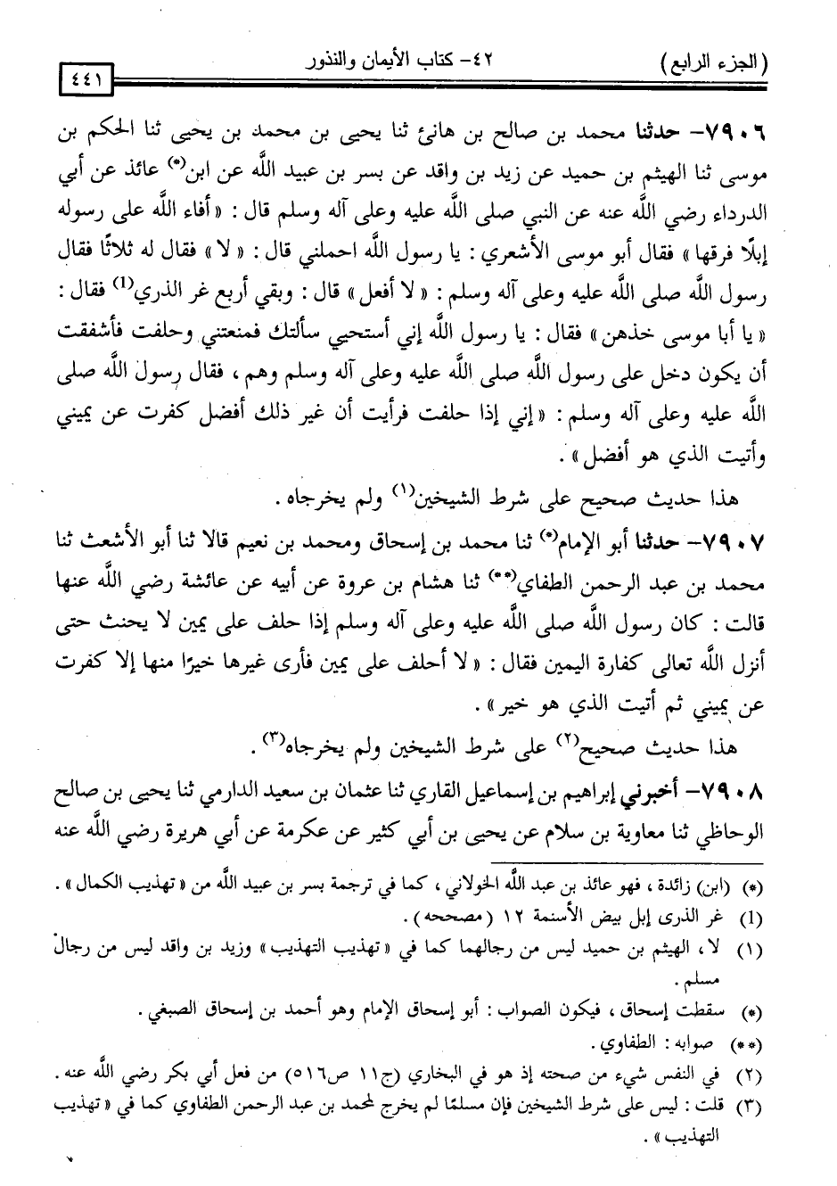 7907 - حَدَّثَنَا أَبُو [الْوَلِيدِ] الْإِمَامُ ، ثَنَا مُحَمَّدُ بْنُ إِسْحَاقَ ، وَمُحَمَّدُ بْنُ نُعَيْمٍ ، قَالَا: ثَنَا أَبُو الْأَشْعَثِ ، ثَنَا مُحَمَّدُ بْنُ عَبْدِ الرَّحْمَنِ الطُّفَاوِيُّ ، ثَنَا هِشَامُ بْنُ عُرْوَةَ ، عَنْ أَبِيهِ ، عَنْ عَائِشَةَ ، رَضِيَ اللَّهُ عَنْهَا قَالَتْ: كَانَ رَسُولُ اللَّهِ صَلَّى اللَّهُ عَلَيْهِ وَسَلَّمَ إِذَا حَلَفَ عَلَى يَمِينٍ لَا يَحْنَثُ حَتَّى أَنْزَلَ اللَّهُ تَعَالَى كَفَّارَةَ الْيَمِينِ ، فَقَالَ: " لَا أَحْلِفُ عَلَى يَمِينٍ فَأَرَى غَيْرَهَا خَيْرًا مِنْهَا إِلَّا كَفَّرْتُ عَنْ يَمِينٍ ثُمَّ أَتَيْتُ الَّذِي هُوَ خَيْرٌ "