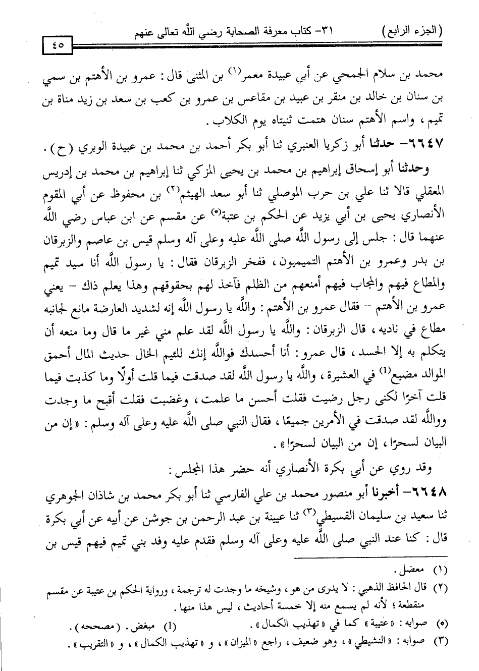 6647 - حَدَّثَنَا أَبُو زَكَرِيَّا الْعَنْبَرِيُّ ، ثَنَا أَبُو بَكْرٍ أَحْمَدُ بْنُ مُحَمَّدِ بْنِ عُبَيْدَةَ الْوَبَرِيُّ ح ، وَحَدَّثَنَا أَبُو إِسْحَاقَ إِبْرَاهِيمُ بْنُ مُحَمَّدِ بْنِ يَحْيَى الْمُزَكِّي ، ثَنَا إِبْرَاهِيمُ بْنُ مُحَمَّدِ بْنِ إِدْرِيسَ الْمَعْقَلِيُّ ، قَالَا: ثَنَا عَلِيُّ بْنُ حَرْبٍ الْمَوْصِلِيُّ ، ثَنَا أَبُو سَعْدٍ الْهَيْثَمُ بْنُ مَحْفُوظٍ ، عَنْ أَبِي الْمُقَوِّمِ الْأَنْصَارِيِّ يَحْيَى بْنِ أَبِي يَزِيدَ ، عَنِ الْحَكَمِ بْنِ عُتْبَةَ ، عَنْ مِقْسَمٍ ، عَنِ ابْنِ عَبَّاسٍ ، رَضِيَ اللَّهُ عَنْهُمَا ، قَالَ: جَلَسَ إِلَى رَسُولِ اللَّهِ صَلَّى اللَّهُ عَلَيْهِ وَسَلَّمَ قَيْسُ بْنُ عَاصِمٍ وَالزِّبْرِقَانُ بْنُ بَدْرٍ ، وَعَمْرُو بْنُ الْأَهْتَمِ التَّمِيمِيُّونَ فَفَخَرَ الزِّبْرِقَانُ ، فَقَالَ: يَا رَسُولَ اللَّهِ ، أَنَا سَيِّدُ تَمِيمٍ ، وَالْمُطَاعُ فِيهِمْ ، وَالْمُجَابُ فِيهِمْ ، أَمْتَعُهُمْ مِنَ الظُّلْمِ فَآخُذُ لَهُمْ بِحُقُوقِهِمْ ، وَهَذَا يَعْلَمُ ذَاكَ يَعْنِي عَمْرَو بْنَ الْأَهْتَمِ ، فَقَالَ: عَمْرُو بْنُ الْأَهْتَمِ: وَاللَّهِ يَا رَسُولَ اللَّهِ ، إِنَّهُ لَشَدِيدُ الْعَارِضَةِ ، مَانِعٌ لِجَانِبِهِ ، مُطَاعٌ فِي نَادِيهِ ، قَالَ الزِّبْرِقَانُ: وَاللَّهِ يَا رَسُولَ اللَّهِ ، لَقَدْ عَلِمَ مِنِّي غَيْرَ مَا قَالَ ، وَمَا مَنَعَهُ أَنْ يَتَكَلَّمَ بِهِ إِلَّا الْحَسَدُ ، قَالَ عَمْرٌو: أَنَا أَحْسُدُكَ فَوَاللَّهِ إِنَّكَ لَئِيمُ الْخَالِ ، حَدِيثُ الْمَالِ ، أَحْمَقُ الْمَوَالِدِ ، مُضَيِّعٌ فِي الْعَشِيرَةِ ، وَاللَّهِ يَا رَسُولَ اللَّهِ لَقَدْ صَدَقْتَ فِيمَا قُلْتَ أَوَّلًا ، وَمَا كَذَبْتَ فِيمَا قُلْتَ آخِرًا ، لَكِنِّي رَجُلٌ رَضِيتُ فَقُلْتُ أَحْسَنَ مَا عَلِمْتَ ، وَغَضِبْتُ فَقُلْتُ أَقْبَحَ مَا وَجَدْتَ ، وَوَاللَّهِ لَقَدْ صَدَقْتَ فِي الْأَمْرِيْنِ جَمِيعًا ، فَقَالَ النَّبِيُّ صَلَّى اللَّهُ عَلَيْهِ وَسَلَّمَ: " إِنَّ مِنَ الْبَيَانِ لَسِحْرًا إِنَّ مِنَ الْبَيَانِ لَسِحْرًا " وَقَدْ رُوِيَ عَنْ أَبِي بَكْرَةَ الْأَنْصَارِيِّ أَنَّهُ حَضَرَ هَذَا الْمَجْلِسَ