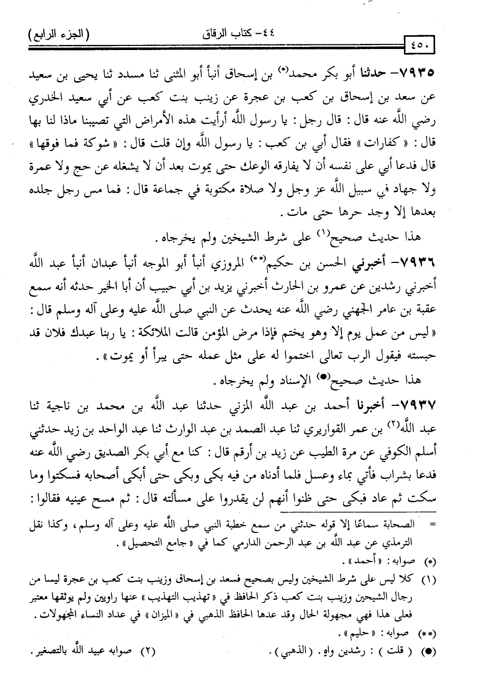 7935 - حَدَّثَنَا أَبُو بَكْرٍ مُحَمَّدُ بْنُ إِسْحَاقَ ، أَنْبَأَ أَبُو الْمُثَنَّى ، ثَنَا مُسَدَّدٌ ، ثَنَا يَحْيَى بْنُ سَعِيدٍ ، عَنْ سَعْدِ بْنِ إِسْحَاقَ بْنِ كَعْبِ بْنِ عُجْرَةَ ، عَنْ زَيْنَبَ بِنْتِ كَعْبٍ ، عَنْ أَبِي سَعِيدٍ الْخُدْرِيِّ ، رَضِيَ اللَّهُ عَنْهُ قَالَ رَجُلٌ: يَا رَسُولَ اللَّهِ ، أَرَأَيْتَ هَذِهِ الْأَمْرَاضَ الَّتِي تُصِيبُنَا مَاذَا لَنَا بِهَا ؟ قَالَ: " كَفَّارَاتٌ " فَقَالَ أُبَيُّ بْنُ كَعْبٍ: يَا رَسُولَ اللَّهِ وَإِنْ قَلَّتْ ؟ قَالَ: " شَوْكَةٌ فَمَا فَوْقَهَا ؟ " قَالَ: " فَدَعَا أُبَيٌّ ، عَلَى نَفْسِهِ أَنْ لَا يُفَارِقَهُ الْوَعَكُ حَتَّى يَمُوتَ بَعْدَ أَنْ لَا يَشْغَلَهُ عَنْ حَجٍّ وَلَا عَمْرَةٍ وَلَا جِهَادٍ فِي سَبِيلِ اللَّهِ عَزَّ وَجَلَّ وَلَا صَلَاةٍ مَكْتُوبَةٍ فِي جَمَاعَةٍ " قَالَ: " فَمَا مَسَّ رَجُلٌ جِلْدَهُ بَعْدَهَا إِلَّا وَجَدَ حَرَّهَا حَتَّى مَاتَ "
