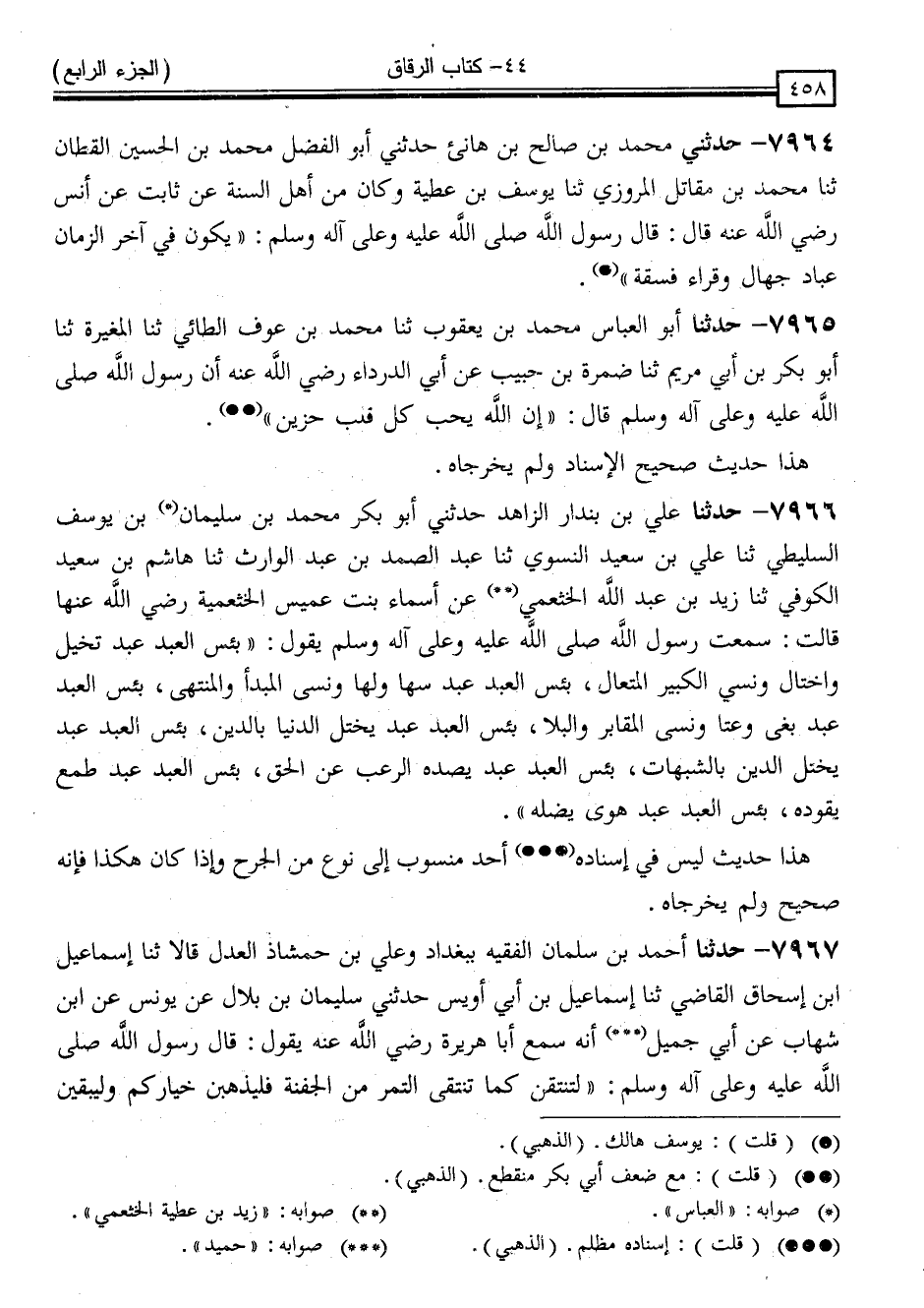 7964 - حَدَّثَنِي مُحَمَّدُ بْنُ صَالِحِ بْنِ هَانِئٍ ، حَدَّثَنِي أَبُو الْفَضْلِ مُحَمَّدُ بْنُ الْحُسَيْنِ الْقَطَّانُ ، ثَنَا مُحَمَّدُ بْنُ مُقَاتِلٍ الْمَرْوَزِيُّ ، ثَنَا يُوسُفُ بْنُ عَطِيَّةَ وَكَانَ مِنْ أَهْلِ السُّنَّةِ ، عَنْ ثَابِتٍ ، عَنْ أَنَسٍ ، رَضِيَ اللَّهُ عَنْهُ قَالَ: قَالَ رَسُولُ اللَّهِ صَلَّى اللَّهُ عَلَيْهِ وَسَلَّمَ: " يَكُونُ فِي آخِرِ الزَّمَانِ عُبَّادٌ جُهَّالٌ وَقُرَّاءُ فَسَقَةٌ "