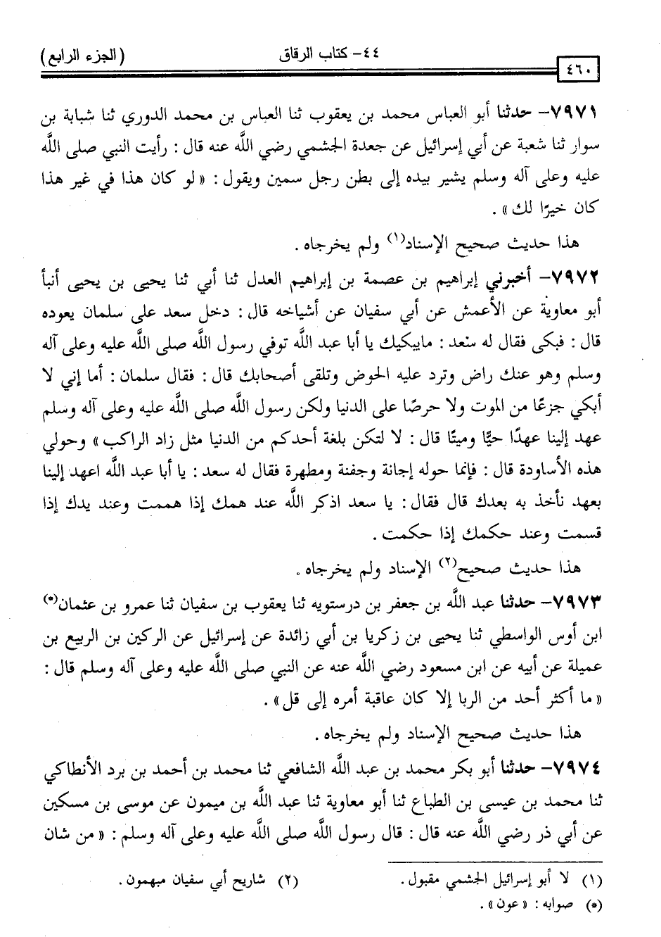 7973 - حَدَّثَنَا عَبْدُ اللَّهِ بْنُ جَعْفَرِ بْنِ دَرَسْتَوَيْهِ ، ثَنَا يَعْقُوبُ بْنُ سُفْيَانَ ، ثَنَا عَمْرُو بْنُ عُثْمَانَ بْنِ أَوْسٍ الْوَاسِطِيُّ ، ثَنَا يَحْيَى بْنُ زَكَرِيَّا بْنِ أَبِي زَائِدَةَ ، عَنْ إِسْرَائِيلَ ، عَنِ الرُّكَيْنِ بْنِ الرَّبِيعِ بْنِ عَمِيلَةَ ، عَنْ أَبِيهِ ، عَنِ ابْنِ مَسْعُودٍ ، رَضِيَ اللَّهُ عَنْهُ ، عَنِ النَّبِيِّ صَلَّى اللَّهُ عَلَيْهِ وَسَلَّمَ قَالَ: " مَا أَكْثَرَ أَحَدٌ مِنَ الرِّبَا إِلَّا كَانَ عَاقِبَةُ أَمْرِهِ إِلَى قُلٍّ "