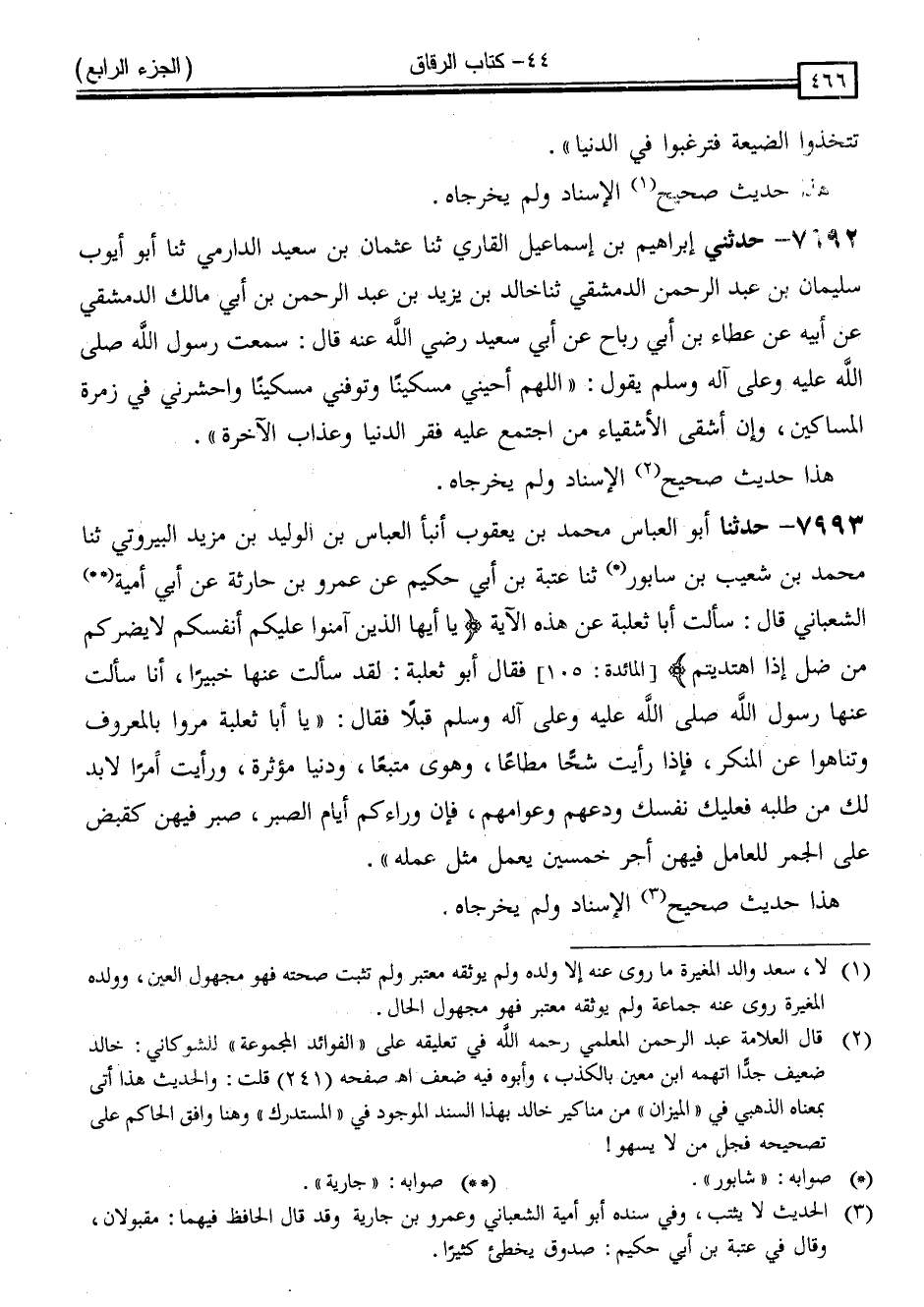 7992 - حَدَّثَنِي إِبْرَاهِيمُ بْنُ إِسْمَاعِيلَ الْقَارِئُ ، ثَنَا عُثْمَانُ بْنُ سَعِيدٍ الدَّارِمِيُّ ، ثَنَا أَبُو أَيُّوبَ سُلَيْمَانُ بْنُ عَبْدِ الرَّحْمَنِ الدِّمَشْقِيُّ ، ثَنَا خَالِدُ بْنُ يَزِيدَ بْنِ عَبْدِ الرَّحْمَنِ بْنِ أَبِي مَالِكٍ الدِّمَشْقِيُّ ، عَنْ أَبِيهِ ، عَنْ عَطَاءِ بْنِ أَبِي رَبَاحٍ ، عَنْ أَبِي سَعِيدٍ ، رَضِيَ اللَّهُ عَنْهُ قَالَ: سَمِعْتُ رَسُولَ اللَّهِ صَلَّى اللَّهُ عَلَيْهِ وَسَلَّمَ يَقُولُ: " اللَّهُمَّ أَحْيِنِي مِسْكِينًا وَتَوَفَّنِي مِسْكِينًا وَاحْشُرْنِي فِي زُمْرَةِ الْمَسَاكِينِ ، وَإِنَّ أَشْقَى الِأَشْقِيَاءِ مَنِ اجْتَمَعَ عَلَيْهِ فَقْرُ الدُّنْيَا وَعَذَابُ الْآخِرَةِ "