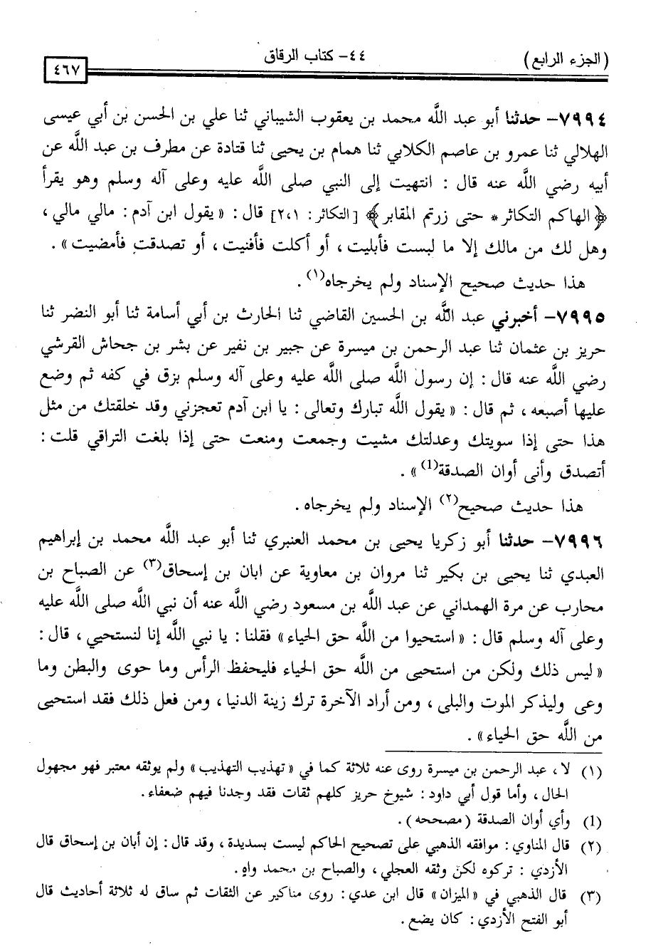7994 - حَدَّثَنَا أَبُو عَبْدِ اللَّهِ مُحَمَّدُ بْنُ يَعْقُوبَ الشَّيْبَانِيُّ ، ثَنَا عَلِيُّ بْنُ الْحَسَنِ بْنِ أَبِي عِيسَى الْهِلَالِيُّ ، ثَنَا عَمْرُو بْنُ عَاصِمٍ الْكِلَابِيُّ ، ثَنَا هَمَّامُ بْنُ يَحْيَى ، ثَنَا قَتَادَةُ ، عَنْ مُطَرِّفِ بْنِ عَبْدِ اللَّهِ ، عَنْ أَبِيهِ ، رَضِيَ اللَّهُ عَنْهُ قَالَ: انْتَهَيْتُ إِلَى النَّبِيِّ صَلَّى اللَّهُ عَلَيْهِ وَسَلَّمَ وَهُوَ يَقْرَأُ: أَلْهَاكُمُ التَّكَاثُرُ حَتَّى زُرْتُمُ الْمَقَابِرَ قَالَ: " يَقُولُ ابْنُ آدَمَ: مَالِي مَالِي ، وَهَلَ لَكَ مِنْ مَالِكَ إِلَّا مَا لَبِسْتَ فَأَبْلَيْتَ أَوْ أَكَلْتَ فَأَفْنَيْتَ أَوْ تَصَدَّقْتَ فَأَمْضَيْتَ "