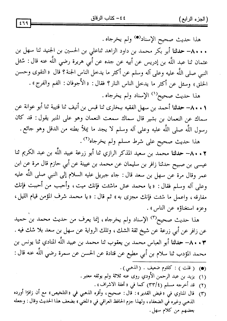 8000 - حَدَّثَنَا أَبُو بَكْرٍ مُحَمَّدُ بْنُ دَاوُدَ الزَّاهِدُ ، ثَنَا عَلِيُّ بْنُ الْحُسَيْنِ بْنِ الْجُنَيْدِ ، ثَنَا سَهْلُ بْنُ عُثْمَانَ ، ثَنَا عَبْدُ اللَّهِ بْنُ إِدْرِيسَ ، عَنْ أَبِيهِ ، عَنْ جَدِّهِ ، عَنْ أَبِي هُرَيْرَةَ رَضِيَ اللَّهُ عَنْهُ قَالَ: سُئِلَ النَّبِيُّ صَلَّى اللَّهُ عَلَيْهِ وَسَلَّمَ عَنْ أَكْثَرَ مَا يُدْخِلُ النَّاسَ الْجَنَّةَ ، قَالَ: " التَّقْوَى وَحُسْنُ الْخُلُقِ " وَسُئِلَ عَنْ أَكْثَرَ مَا يُدْخِلُ النَّاسَ النَّارَ ، فَقَالَ: " الْأَجْوَفَانِ: الْفَمُ وَالْفَرْجُ "