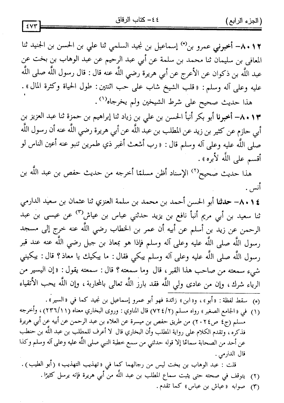 8012 - أَخْبَرَنِي [أَبُو] عَمْرٍو (بْنُ) إِسْمَاعِيلُ بْنُ نُجَيْدٍ السُّلَمِيُّ ، ثَنَا عَلِيُّ بْنُ الْحَسَنِ بْنِ الْجُنَيْدِ ، ثَنَا الْمُعَافَى بْنُ سُلَيْمَانَ ، ثَنَا مُحَمَّدُ بْنُ سَلَمَةَ ، عَنْ أَبِي عَبْدِ الرَّحِيمِ ، عَنْ عَبْدِ الْوَهَّابِ بْنِ بُخْتٍ ، عَنْ عَبْدِ اللَّهِ بْنِ ذَكْوَانَ ، عَنِ الْأَعْرَجِ ، عَنْ أَبِي هُرَيْرَةَ ، رَضِيَ اللَّهُ عَنْهُ قَالَ: قَالَ رَسُولُ اللَّهِ صَلَّى اللَّهُ عَلَيْهِ وَسَلَّمَ: " قَلْبُ الشَّيْخِ شَابَ عَلَى حُبِّ اثْنَتَيْنِ: طُولِ الْحَيَاةِ وَكَثْرَةِ الْمَالِ "