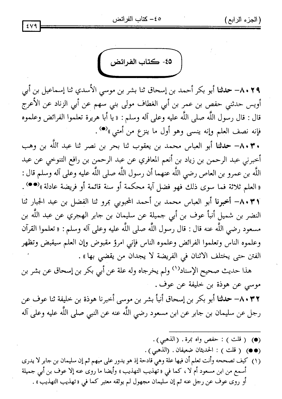 8032 - حَدَّثَنَا أَبُو بَكْرِ بْنُ إِسْحَاقَ ، أَنْبَأَ بِشْرُ بْنُ مُوسَى ، أَخْبَرَنَا هَوْذَةُ بْنُ خَلِيفَةَ ، ثَنَا عَوْفٌ ، عَنْ رَجُلٍ ، عَنْ سُلَيْمَانَ بْنِ جَابِرٍ ، عَنِ ابْنِ مَسْعُودٍ ، رَضِيَ اللَّهُ عَنْهُ ، عَنِ النَّبِيِّ صَلَّى اللَّهُ عَلَيْهِ -[480]- وَسَلَّمَ قَالَ: " تَعَلَّمُوا الْفَرَائِضَ وَعَلِّمُوهُ النَّاسَ فَإِنِّي امْرُؤٌ مَقْبُوضٌ ، وَإِنَّ الْعِلْمَ سَيُقْبَضُ حَتَّى يَخْتَلِفَ الِاثْنَانِ فِي الْفَرِيضَةِ فَلَا يَجِدَانِ أَحَدًا يَفْصِلُ بَيْنَهُمَا "