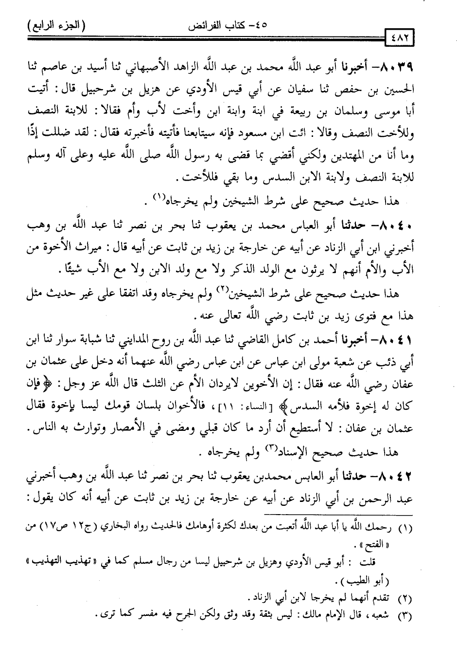 8039 - أَخْبَرَنَا أَبُو عَبْدِ اللَّهِ مُحَمَّدُ بْنُ عَبْدِ اللَّهِ الزَّاهِدُ الْأَصْبَهَانِيُّ ، ثَنَا أُسَيْدُ بْنُ عَاصِمٍ ، ثَنَا الْحُسَيْنُ بْنُ حَفْصٍ ، ثَنَا سُفْيَانُ ، عَنْ أَبِي قَيْسٍ الْأَوْدِيِّ ، عَنْ هُزَيْلِ بْنِ شُرَحْبِيلَ ، قَالَ: أَتَيْتُ أَبَا مُوسَى وَسَلْمَانَ بْنَ رَبِيعَةَ فِي ابْنَةٍ وَابْنَةِ ابْنٍ وَأُخْتٍ لِأَبٍ وَأُمٍّ ، فَقَالَا: لِلِابْنَةِ النِّصْفُ وَلِلْأُخْتِ النِّصْفُ ، وَقَالَا: ائْتِ ابْنَ مَسْعُودٍ ، فَإِنَّهُ سَيُتَابِعُنَا ، فَأَتَيْتُهُ فَأَخْبَرْتُهُ فَقَالَ: لَقَدْ ضَلَلْتُ إِذًا وَمَا أَنَا مِنَ الْمُهْتَدِينَ وَلَكِنِّي " أَقْضِي بِمَا قَضَى بِهِ رَسُولُ اللَّهِ صَلَّى اللَّهُ عَلَيْهِ وَسَلَّمَ: لِلِابْنَةِ النِّصْفُ وَلِابْنَةِ الِابْنِ السُّدُسُ وَمَا بَقِيَ فَلِلْأُخْتِ "