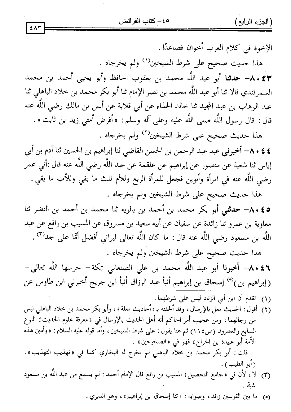 8043 - حَدَّثَنَا أَبُو عَبْدِ اللَّهِ مُحَمَّدُ بْنُ يَعْقُوبَ الْحَافِظُ ، وَأَبُو يَحْيَى أَحْمَدُ بْنُ مُحَمَّدٍ السَّمَرْقَنْدِيُّ ، قَالَا: ثَنَا أَبُو عَبْدِ اللَّهِ مُحَمَّدُ بْنُ نَصْرٍ الْإِمَامُ ، ثَنَا أَبُو بَكْرٍ مُحَمَّدُ بْنُ خَلَّادٍ الْبَاهِلِيُّ ، ثَنَا عَبْدُ الْوَهَّابِ بْنُ عَبْدِ الْمَجِيدِ ، ثَنَا خَالِدٌ الْحَذَّاءُ ، عَنْ أَبِي قِلَابَةَ ، عَنْ أَنَسِ بْنِ مَالِكٍ ، رَضِيَ اللَّهُ عَنْهُ قَالَ: قَالَ رَسُولُ اللَّهِ صَلَّى اللَّهُ عَلَيْهِ وَسَلَّمَ: " أَفْرَضُ أُمَّتِي زَيْدُ بْنُ ثَابِتٍ "