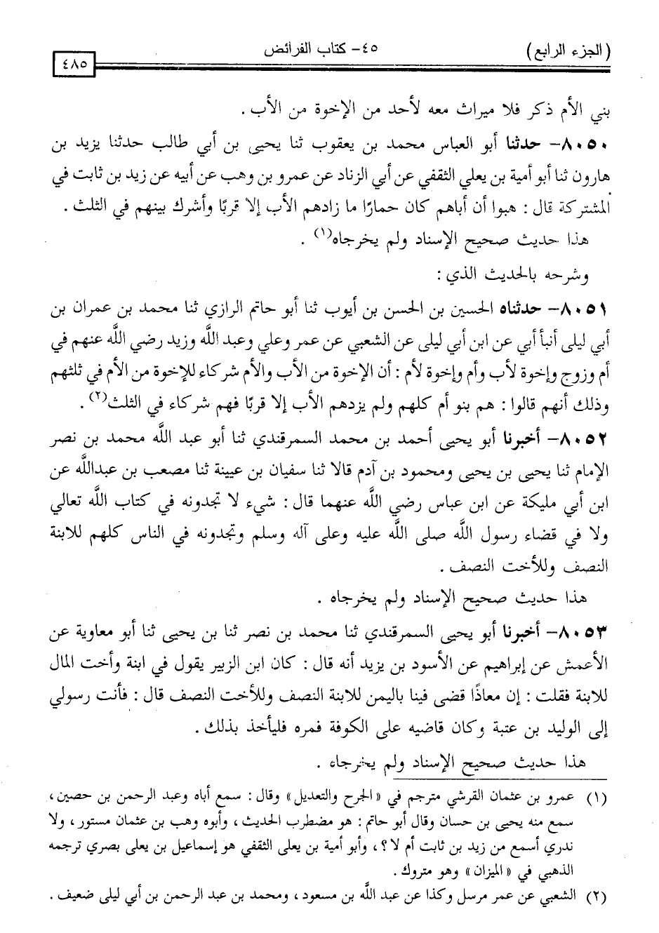 8051 - حَدَّثَنَاهُ الْحُسَيْنُ بْنُ الْحَسَنِ بْنِ أَيُّوبَ ، ثَنَا أَبُو حَاتِمٍ الرَّازِيُّ ، ثَنَا مُحَمَّدُ بْنُ عِمْرَانَ بْنِ أَبِي لَيْلَى ، أَنْبَأَ أَبِي ، عَنِ ابْنِ أَبِي لَيْلَى ، عَنِ الشَّعْبِيِّ ، عَنْ عُمَرَ ، وَعَلِيٍّ ، وَعَبْدِ اللَّهِ ، وَزَيْدٍ ، رَضِيَ اللَّهُ عَنْهُمْ ، فِي أُمٍّ وَزَوْجٍ وَإِخْوَةٍ لِأَبٍ وَأُمٍّ وَإِخْوَةٍ لِأُمٍّ: " أَنَّ الْإِخْوَةَ مِنَ الْأَبِ وَالْأُمِّ شُرَكَاءُ لِلْإِخْوَةِ مِنَ الْأُمِّ فِي ثُلُثِهِمْ ، وَذَلِكَ أَنَّهُمْ قَالُوا هُمْ بَنُو أُمٍّ كُلُّهُمْ وَلَمْ يَزِدْهُمُ الْأَبُ إِلَّا قُرْبًا فَهُمْ شُرَكَاءُ فِي الثُّلُثِ "