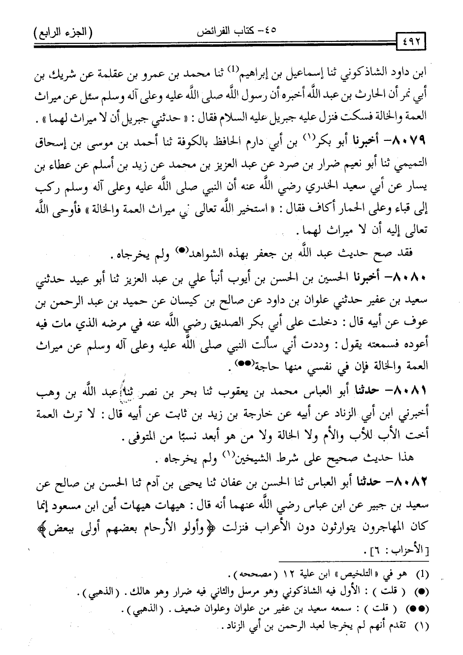 8079 - أَخْبَرَنَا أَبُو بَكْرِ بْنُ أَبِي دَارِمٍ الْحَافِظُ ، بِالْكُوفَةِ ، ثَنَا أَحْمَدُ بْنُ مُوسَى بْنِ إِسْحَاقَ التَّمِيمِيُّ ، ثَنَا أَبُو نُعَيْمٍ ضِرَارُ بْنُ صُرَدَ ، عَنْ عَبْدِ الْعَزِيزِ بْنِ مُحَمَّدٍ ، عَنْ زَيْدِ بْنِ أَسْلَمَ ، عَنْ عَطَاءِ بْنِ يَسَارٍ ، عَنْ أَبِي سَعِيدٍ الْخُدْرِيِّ ، رَضِيَ اللَّهُ عَنْهُ أَنَّ النَّبِيَّ صَلَّى اللَّهُ عَلَيْهِ وَسَلَّمَ رَكِبَ إِلَى قُبَاءَ وَعَلَى الْحِمَارِ إِكَافٌ ، فَقَالَ: " أَسْتَخِيرُ اللَّهَ تَعَالَى فِي مِيرَاثِ الْعَمَّةِ وَالْخَالَةِ " فَأَوْحَى اللَّهُ تَعَالَى إِلَيْهِ أَنَّ لَا مِيرَاثَ لَهُمَا
