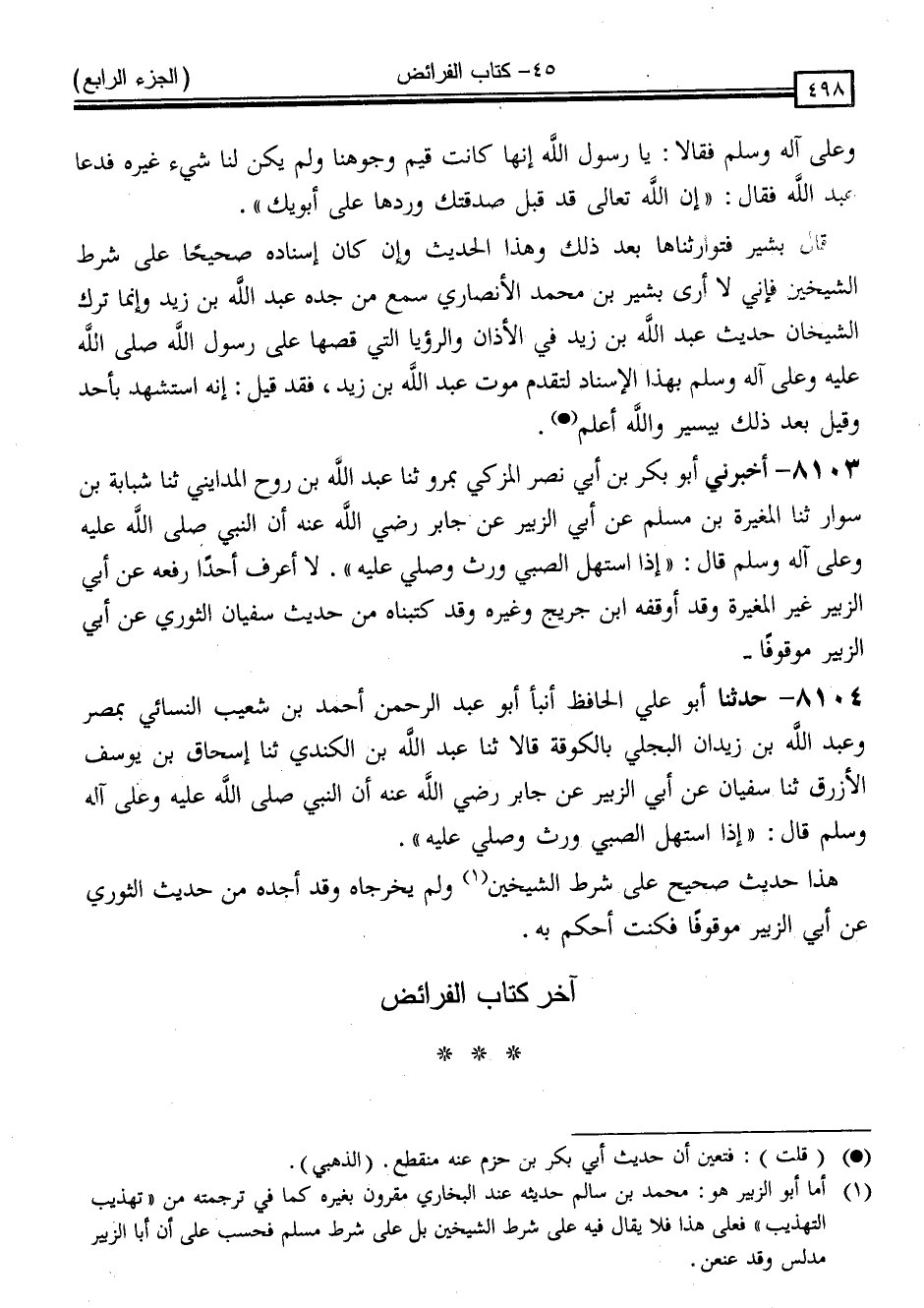 8104 - حَدَّثَنَا أَبُو عَلِيٍّ الْحَافِظُ ، أَنْبَأَ أَبُو عَبْدِ الرَّحْمَنِ أَحْمَدُ بْنُ شُعَيْبٍ النَّسَائِيُّ بِمِصْرَ ، وَعَبْدُ اللَّهِ بْنُ زَيْدَانَ الْبَجَلِيُّ بِالْكُوفَةِ ، قَالَا: ثَنَا عَبْدُ اللَّهِ بْنُ الْكِنْدِيِّ ، ثَنَا إِسْحَاقُ بْنُ يُوسُفَ الْأَزْرَقُ ، ثَنَا سُفْيَانُ ، عَنْ أَبِي الزُّبَيْرِ ، عَنْ جَابِرٍ رَضِيَ اللَّهُ عَنْهُ ، أَنَّ النَّبِيَّ صَلَّى اللَّهُ عَلَيْهِ وَسَلَّمَ قَالَ: " إِذَا اسْتَهَلَّ الصَّبِيُّ وَرِثَ وَصُلِّيَ عَلَيْهِ "