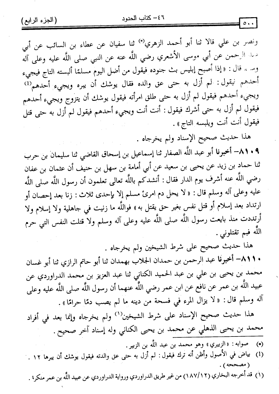 8110 - أَخْبَرَنَا عَبْدُ الرَّحْمَنِ بْنُ حَمْدَانَ الْجَلَّابُ ، بِهَمْدَانَ ، ثَنَا أَبُو حَاتِمٍ الرَّازِيُّ ، ثَنَا أَبُو غَسَّانَ مُحَمَّدُ بْنُ يَحْيَى بْنِ عَلِيِّ بْنِ عَبْدِ الْحَمِيدِ الْكِنَانِيُّ ، ثَنَا عَبْدُ الْعَزِيزِ بْنُ مُحَمَّدٍ الدَّرَاوَرْدِيُّ ، عَنْ عُبَيْدِ اللَّهِ بْنِ عُمَرَ ، عَنْ نَافِعٍ ، عَنِ ابْنِ عُمَرَ رَضِيَ اللَّهُ عَنْهُمَا ، أَنَّ رَسُولَ اللَّهِ صَلَّى اللَّهُ عَلَيْهِ وَسَلَّمَ قَالَ: " لَا يَزَالُ الْمَرْءُ فِي فُسْحَةٍ مِنْ دِينِهِ مَا لَمْ يُصِبْ دَمًا حَرَامًا "