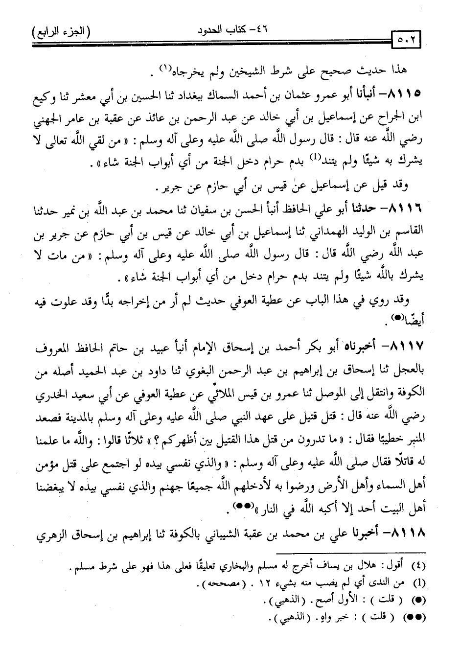 8116 - حَدَّثَنَا أَبُو عَلِيٍّ الْحَافِظُ ، أَنْبَأَ الْحَسَنُ بْنُ سُفْيَانَ ، ثَنَا مُحَمَّدُ بْنُ عَبْدِ اللَّهِ بْنِ نُمَيْرٍ ، حَدَّثَنَا الْقَاسِمُ بْنُ الْوَلِيدِ الْهَمْدَانِيُّ ، ثَنَا إِسْمَاعِيلُ بْنُ أَبِي خَالِدٍ ، عَنْ قَيْسِ بْنِ أَبِي حَازِمٍ ، عَنْ جَرِيرِ بْنِ عَبْدِ اللَّهِ رَضِيَ اللَّهُ عَنْهُ قَالَ: قَالَ رَسُولُ اللَّهِ صَلَّى اللَّهُ عَلَيْهِ وَسَلَّمَ: " مَنْ مَاتَ لَا يُشْرِكُ بِاللَّهِ شَيْئًا وَلَمْ يَتَنَدَّ بِدَمٍ حَرَامٍ دَخَلَ مِنْ أَيِّ أَبْوَابِ الْجَنَّةِ شَاءَ "