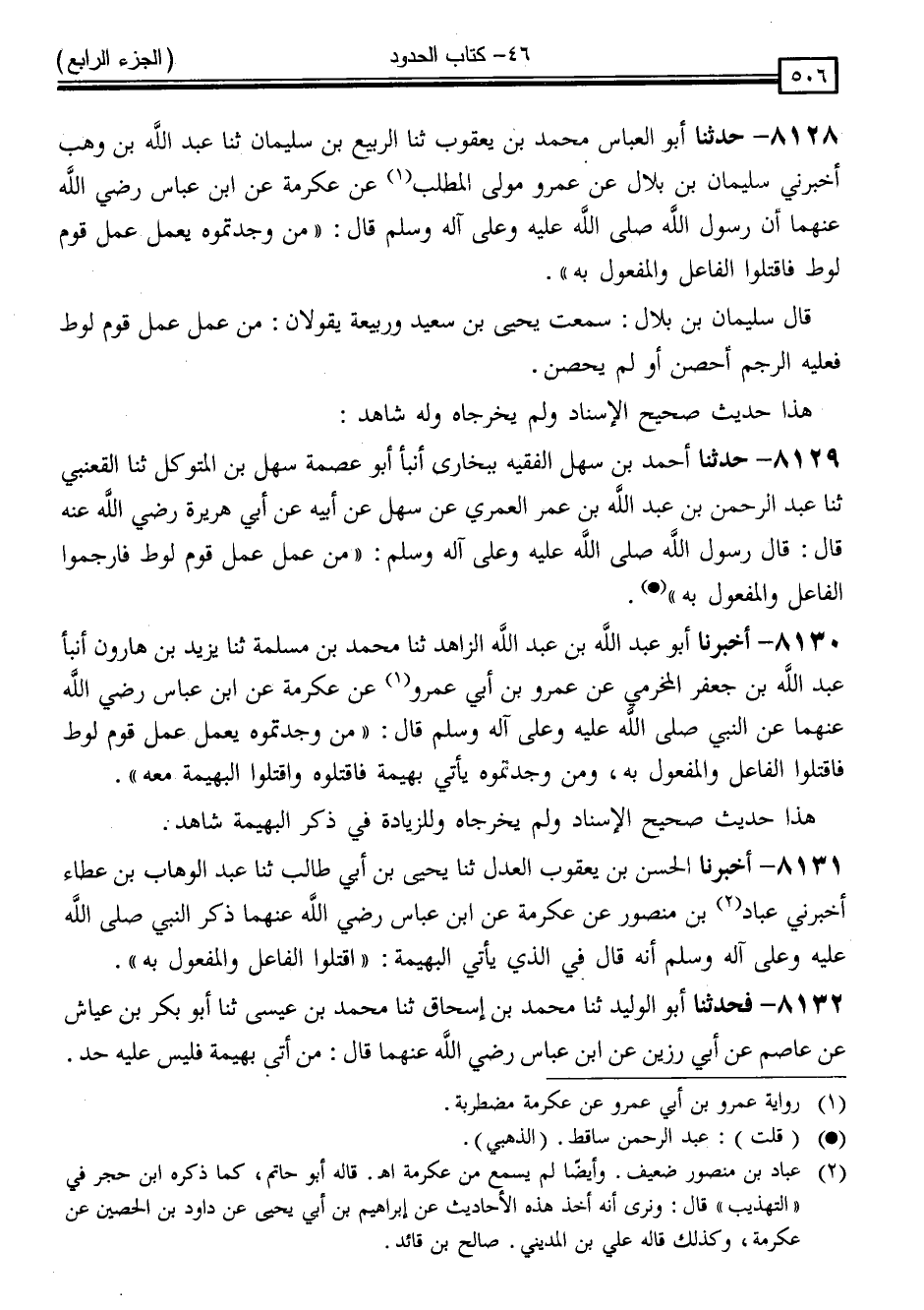 8130 - أَخْبَرَنَا أَبُو عَبْدِ اللَّهِ مُحَمَّدُ بْنُ عَبْدِ اللَّهِ الزَّاهِدُ ، ثَنَا مُحَمَّدُ بْنُ مَسْلَمَةَ ، ثَنَا يَزِيدُ بْنُ هَارُونَ ، أَنْبَأَ عَبْدُ اللَّهِ بْنُ جَعْفَرٍ الْمُخَرِّمِيُّ ، عَنْ عَمْرِو بْنِ أَبِي عَمْرٍو ، عَنْ عِكْرِمَةَ ، عَنِ ابْنِ عَبَّاسٍ رَضِيَ اللَّهُ عَنْهُمَا ، عَنِ النَّبِيِّ صَلَّى اللَّهُ عَلَيْهِ وَسَلَّمَ قَالَ: " مَنْ وَجَدْتُمُوهُ يَعْمَلُ عَمَلَ قَوْمِ لُوطٍ فَاقْتُلُوا الْفَاعِلَ وَالْمَفْعُولَ بِهِ ، وَمَنْ وَجَدْتُمُوهُ يَأْتِي بَهِيمَةً فَاقْتُلُوهُ وَاقْتُلُوا الْبَهِيمَةَ مَعَهُ "