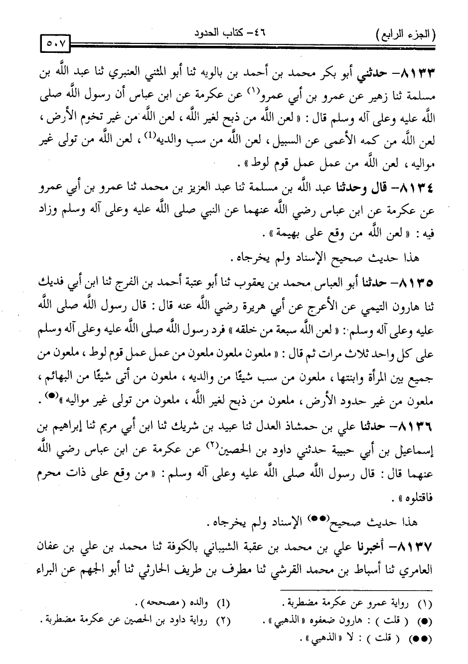 8133 - حَدَّثَنِي أَبُو بَكْرٍ مُحَمَّدُ بْنُ أَحْمَدَ بْنِ بَالَوَيْهِ ، ثَنَا أَبُو الْمُثَنَّى الْعَنْبَرِيُّ ، ثَنَا عَبْدُ اللَّهِ بْنُ مَسْلَمَةَ ، ثَنَا زُهَيْرٌ ، عَنْ عَمْرِو بْنِ أَبِي عَمْرٍو ، عَنْ عِكْرِمَةَ ، عَنِ ابْنِ عَبَّاسٍ ، أَنَّ رَسُولَ اللَّهِ صَلَّى اللَّهُ عَلَيْهِ وَسَلَّمَ قَالَ: " لَعَنَ اللَّهُ مَنْ ذَبَحَ لِغَيْرِ اللَّهِ ، لَعَنَ اللَّهُ مَنْ غَيَّرَ تُخُومَ الْأَرْضِ ، لَعَنَ اللَّهُ مَنْ كَمَّهَ الْأَعْمَى عَنِ السَّبِيلِ ، لَعَنَ اللَّهُ مَنْ سَبَّ وَالِدَيْهِ ، لَعَنَ اللَّهُ مَنْ تَوَلَّى غَيْرَ مَوَالِيهِ ، لَعَنَ اللَّهُ مَنْ عَمِلَ عَمَلَ قَوْمِ لُوطٍ "