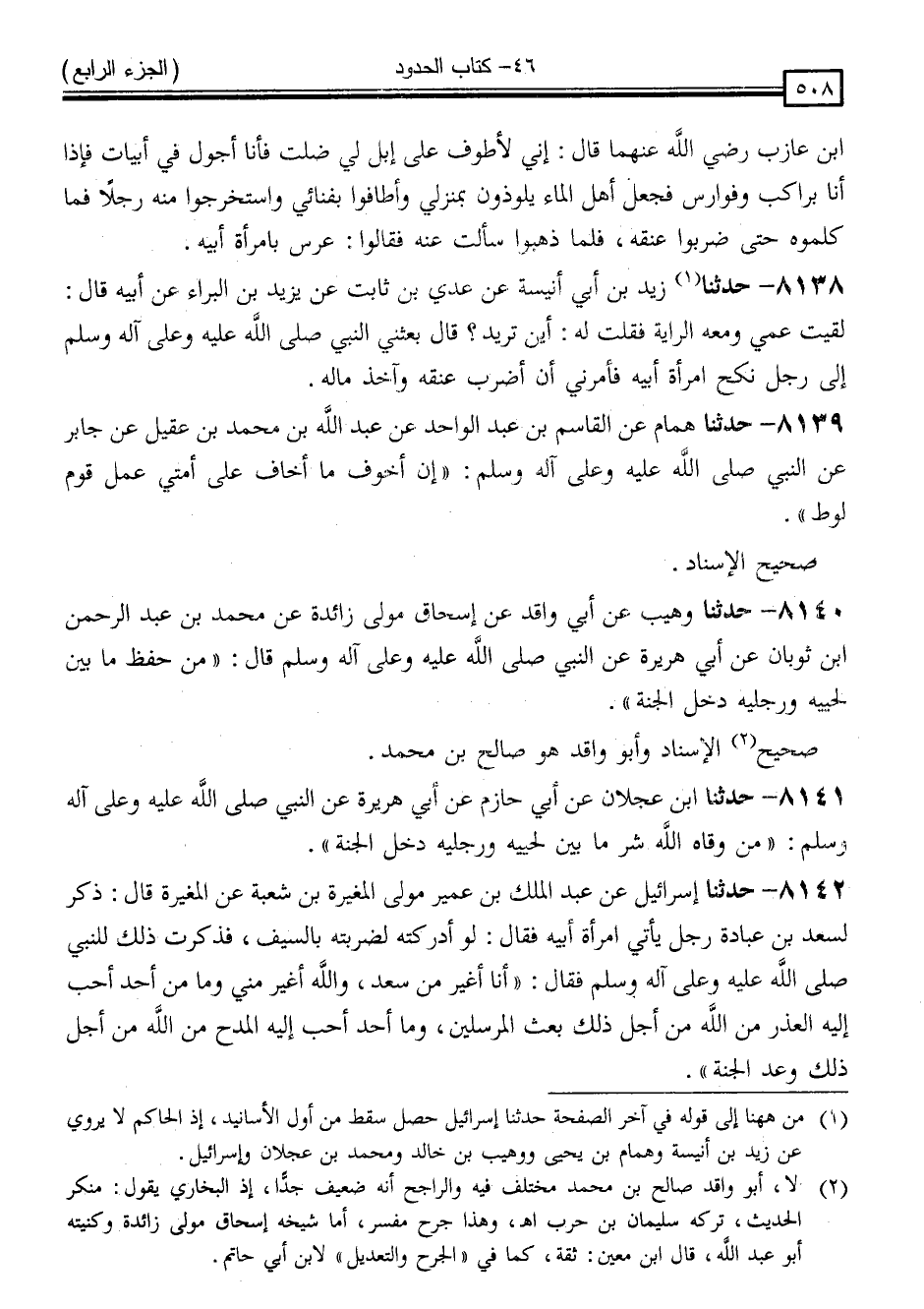 8140 - حَدَّثَنَا [إِبْرَاهِيمُ بْنُ عِصْمَةَ بْنِ إِبْرَاهِيمَ الْعَدْلُ ، ثَنَا السَّرِيُّ بْنُ خُزَيْمَةَ ، ثَنَا مُعَلَّى بْنُ أَسَدٍ ، ثَنَا] وُهَيْبٌ ، عَنْ أَبِي وَاقِدٍ ، عَنْ إِسْحَاقَ ، مَوْلَى زَائِدَةَ ، عَنْ مُحَمَّدِ بْنِ عَبْدِ الرَّحْمَنِ بْنِ ثَوْبَانَ ، عَنْ أَبِي هُرَيْرَةَ ، عَنِ النَّبِيِّ صَلَّى اللَّهُ عَلَيْهِ وَسَلَّمَ قَالَ: " مَنْ حَفِظَ مَا بَيْنَ لَحْيَيْهِ وَرِجْلَيْهِ دَخَلَ الْجَنَّةَ "