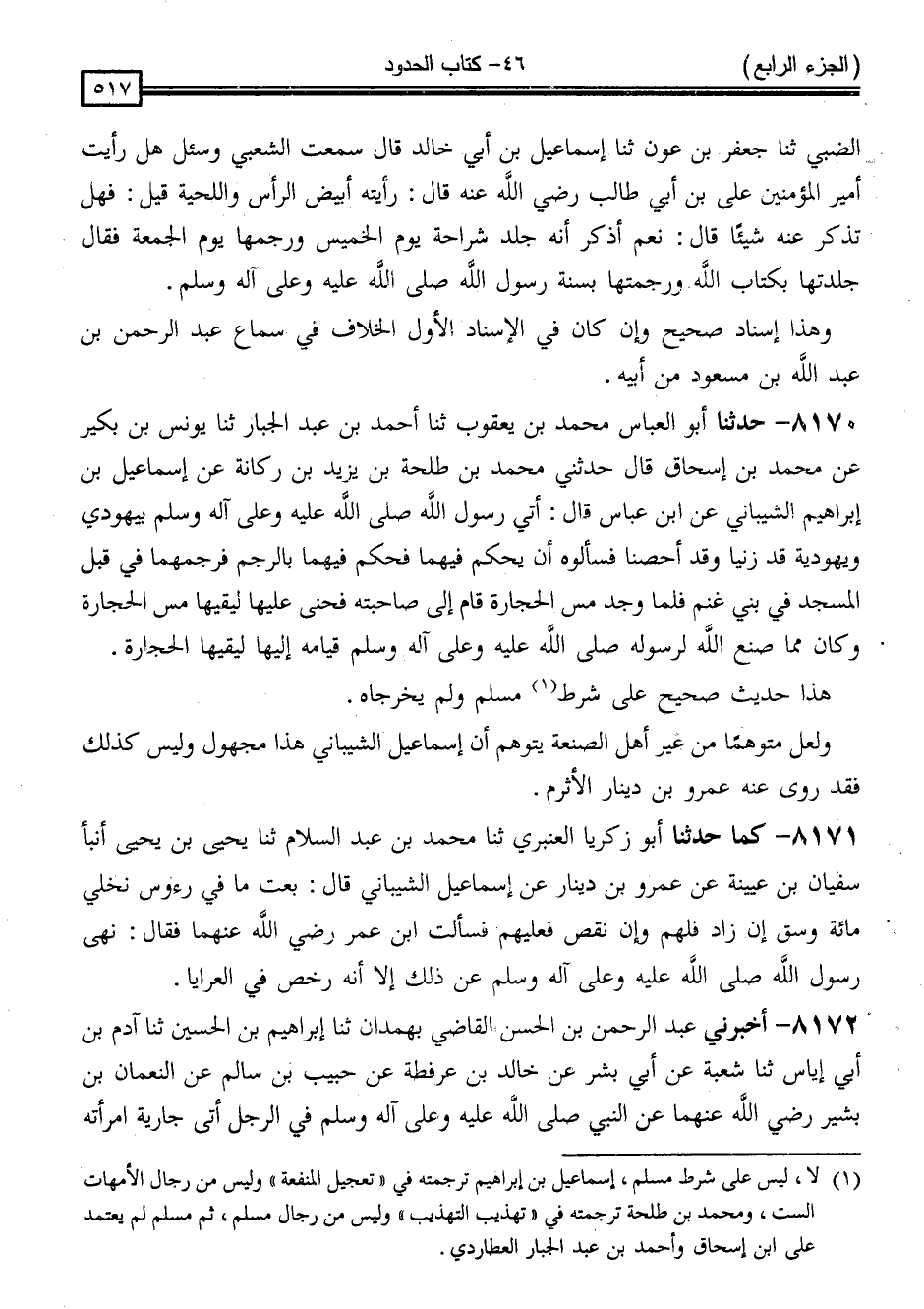 8170 - حَدَّثَنَا أَبُو الْعَبَّاسِ مُحَمَّدُ بْنُ يَعْقُوبَ ، ثَنَا أَحْمَدُ بْنُ عَبْدِ الْجَبَّارِ ، ثَنَا يُونُسُ بْنُ بُكَيْرٍ ، عَنْ مُحَمَّدِ بْنِ إِسْحَاقَ ، قَالَ: حَدَّثَنِي مُحَمَّدُ بْنُ طَلْحَةَ بْنِ يَزِيدَ بْنِ رُكَانَةَ ، عَنْ إِسْمَاعِيلَ بْنِ إِبْرَاهِيمَ الشَّيْبَانِيِّ ، عَنِ ابْنِ عَبَّاسٍ ، قَالَ: " أُتِيَ رَسُولُ اللَّهِ صَلَّى اللَّهُ عَلَيْهِ وَسَلَّمَ بِيَهُودِيٍّ وَيَهُودِيَّةٍ قَدْ زَنَيَا وَقَدْ أُحْصِنَا فَسَأَلُوهُ أَنْ يَحْكُمَ فِيهِمَا فَحَكَمَ فِيهِمَا بِالرَّجْمِ فَرَجَمَهُمَا فِي قُبُلِ الْمَسْجِدِ فِي بَنِي غَنْمٍ ، فَلَمَّا وَجَدَ مَسَّ الْحِجَارَةِ قَامَ إِلَى صَاحَبْتِهِ فَحَنَى عَلَيْهَا لِيَقِيَهَا مَسَّ الْحِجَارَةِ وَكَانَ مِمَّا صَنَعَ اللَّهُ لِرَسُولِهِ صَلَّى اللَّهُ عَلَيْهِ وَسَلَّمَ قِيَامَهُ إِلَيْهَا لِيَقِيَهَا الْحِجَارَةَ "