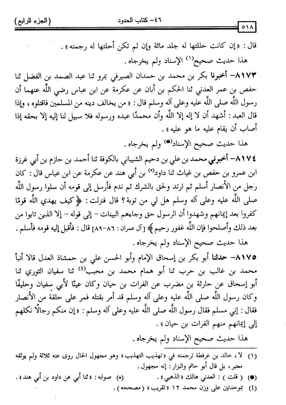 8173 - أَخْبَرَنَا بَكْرُ بْنُ مُحَمَّدِ بْنِ حَمْدَانَ الصَّيْرَفِي ، بِمَرْوَ ثَنَا عَبْدُ الصَّمَدِ بْنُ الْفَضْلِ ، ثَنَا حَفْصُ بْنُ عُمَرَ الْعَدَنِيُّ ، ثَنَا الْحَكَمُ بْنُ أَبَانَ ، عَنْ عِكْرِمَةَ ، عَنِ ابْنِ عَبَّاسٍ رَضِيَ اللَّهُ عَنْهُمَا ، أَنَّ رَسُولَ اللَّهِ صَلَّى اللَّهُ عَلَيْهِ وَسَلَّمَ قَالَ: " مَنْ يُخَالِفْ دِينَهُ مِنَ الْمُسْلِمِينَ فَاقْتُلُوهُ ، وَإِذَا قَالَ الْعَبْدُ أَشْهَدُ أَنْ لَا إِلَهَ إِلَّا اللَّهُ وَأَنَّ مُحَمَّدًا عَبْدُهُ وَرَسُولُهُ فَلَا سَبِيلَ لَنَا إِلَيْهِ إِلَّا بِحَقِّهِ إِذَا أَصَابَ أَنْ يُقَامَ عَلَيْهِ مَا هُوَ عَلَيْهِ "