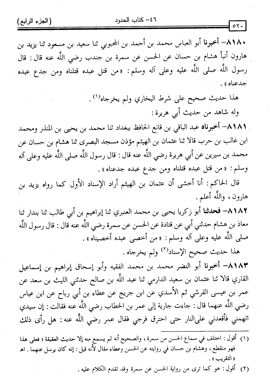 8180 - أَخْبَرَنَا أَبُو الْعَبَّاسِ مُحَمَّدُ بْنُ أَحْمَدَ (بْنِ) الْمَحْبُوبِيُّ ، ثَنَا سَعِيدُ بْنُ مَسْعُودٍ ، ثَنَا يَزِيدُ بْنُ هَارُونَ ، أَنْبَأَ هِشَامُ بْنُ حَسَّانَ ، عَنِ الْحَسَنِ ، عَنْ سَمُرَةَ بْنِ جُنْدُبٍ رَضِيَ اللَّهُ عَنْهُ قَالَ: قَالَ رَسُولُ اللَّهِ صَلَّى اللَّهُ عَلَيْهِ وَسَلَّمَ: " مَنْ قَتَلَ عَبْدَهُ قَتَلْنَاهُ ، وَمَنْ جَدَعَ عَبْدَهُ جَدَعْنَاهُ "