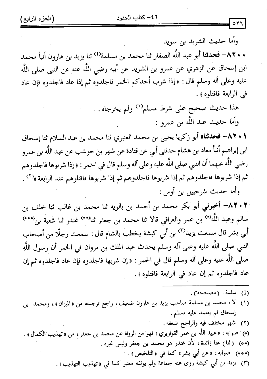 8200 - فَحَدَّثَنَا أَبُو عَبْدِ اللَّهِ الصَّفَّارُ ، ثَنَا مُحَمَّدُ بْنُ مَسْلَمَةَ ، ثَنَا يَزِيدُ بْنُ هَارُونَ ، أَنْبَأَ مُحَمَّدُ بْنُ إِسْحَاقَ ، عَنِ الزُّهْرِيِّ ، عَنْ عَمْرِو بْنِ الشَّرِيدِ ، عَنْ أَبِيهِ رَضِيَ اللَّهُ عَنْهُ ، عَنِ النَّبِيِّ صَلَّى اللَّهُ عَلَيْهِ وَسَلَّمَ قَالَ: " إِذَا شَرِبَ أَحَدُكُمُ الْخَمْرَ فَاجْلِدُوهُ ، ثُمَّ إِنْ عَادَ فَاجْلِدُوهُ ، فَإِنْ عَادَ فِي الرَّابِعَةِ فَاقْتُلُوهُ "