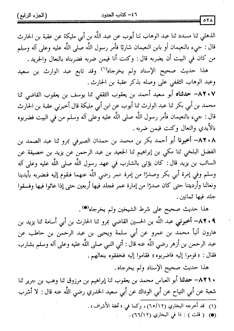 8208 - أَخْبَرَنَا أَبُو أَحْمَدَ بَكْرُ بْنُ مُحَمَّدِ بْنِ حَمْدَانَ الصَّيْرَفِيُّ بِمَرْوَ ، ثَنَا عَبْدُ الصَّمَدِ بْنُ الْفَضْلِ الْبَلْخِيُّ ، ثَنَا مَكِّيُّ بْنُ إِبْرَاهِيمَ ، ثَنَا الْجُعَيْدُ بْنُ عَبْدِ الرَّحْمَنِ ، عَنْ يَزِيدَ بْنِ خُصَيْفَةَ ، عَنِ السَّائِبِ بْنِ يَزِيدَ ، قَالَ: " كَانَ يُؤْتَى بِالشَّارِبِ فِي عَهْدِ رَسُولِ اللَّهِ صَلَّى اللَّهُ عَلَيْهِ وَسَلَّمَ وَفِي إِمْرَةِ أَبِي بَكْرٍ وَصَدْرًا مِنْ إِمْرَةِ عُمَرَ رَضِيَ اللَّهُ عَنْهُمَا فَنَقُومُ إِلَيْهِ فَنَضْرِبُهُ بِأَيْدِينَا وَنِعَالِنَا وَأَرْدِيَتِنَا ، حَتَّى كَانَ صَدْرًا مِنْ إِمَارَةِ عُمَرَ فَجَلَدَ فِيهَا أَرْبَعِينَ ، حَتَّى إِذَا عَاثُوا فِيهَا وَفَسَقُوا جَلْدَ فِيهَا ثَمَانِينَ "