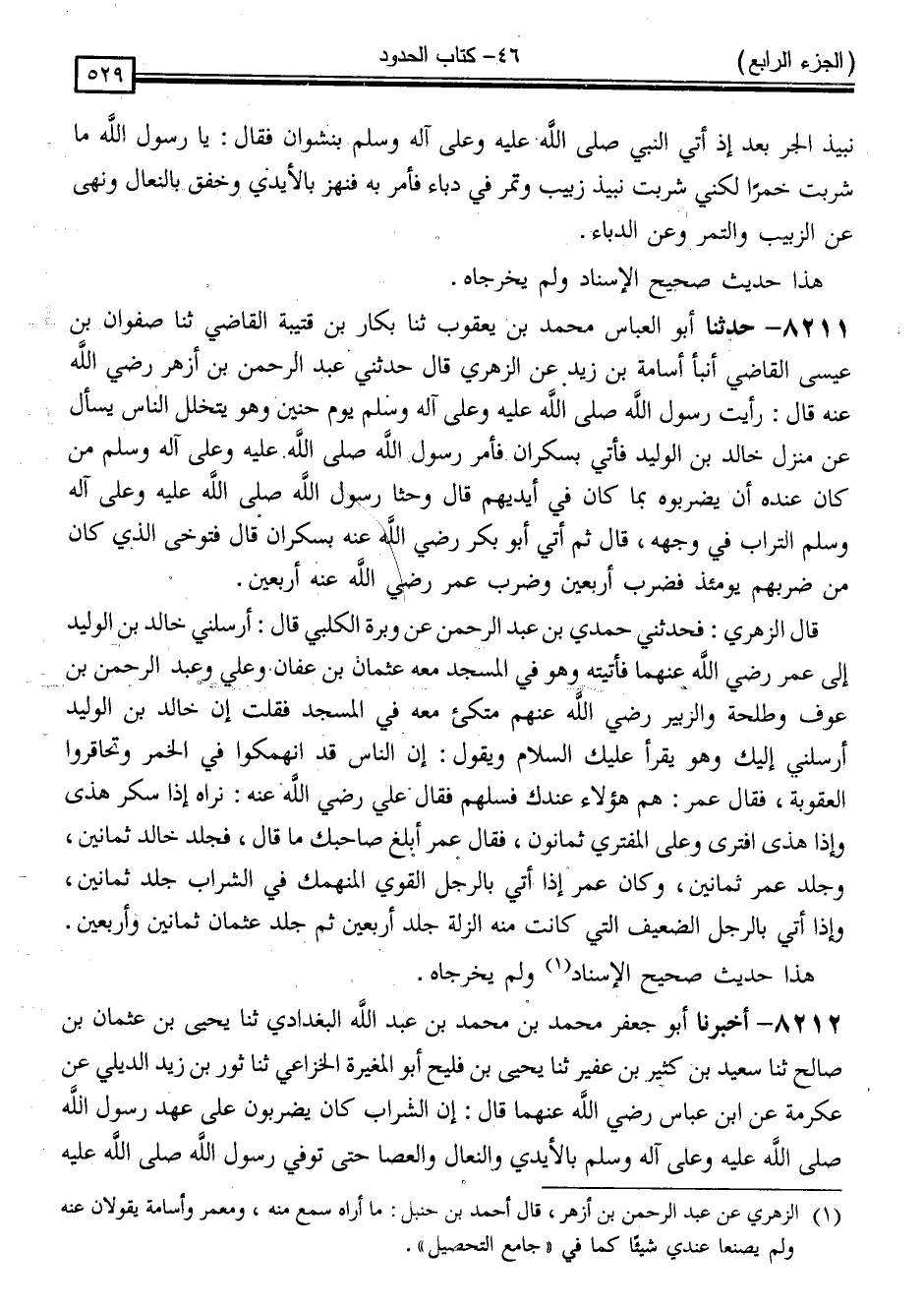 8211 - حَدَّثَنَا أَبُو الْعَبَّاسِ مُحَمَّدُ بْنُ يَعْقُوبَ ، ثَنَا بَكَّارُ بْنُ قُتَيْبَةَ الْقَاضِي ، ثَنَا صَفْوَانُ بْنُ عِيسَى الْقَاضِي ، أَنْبَأَ أُسَامَةُ بْنُ زَيْدٍ ، عَنِ الزُّهْرِيِّ ، قَالَ: حَدَّثَنِي عَبْدُ الرَّحْمَنِ بْنُ أَزْهَرَ ، رَضِيَ اللَّهُ عَنْهُ ، قَالَ: " رَأَيْتُ رَسُولَ اللَّهِ صَلَّى اللَّهُ عَلَيْهِ وَسَلَّمَ يَوْمَ حُنَيْنٍ وَهُوَ يَتَخَلَّلُ النَّاسَ يَسْأَلُ عَنْ مَنْزِلِ خَالِدِ بْنِ الْوَلِيدِ ، فَأُتِيَ بِسَكْرَانَ فَأَمَرَ رَسُولُ اللَّهِ صَلَّى اللَّهُ عَلَيْهِ وَسَلَّمَ مَنْ كَانَ عِنْدَهُ أَنْ يَضْرِبُوهُ بِمَا كَانَ فِي أَيْدِيهِمْ " قَالَ: " وَحَثَا رَسُولُ اللَّهِ صَلَّى اللَّهُ عَلَيْهِ وَسَلَّمَ التُّرَابَ فِي وَجْهِهِ " قَالَ: " ثُمَّ أُتِيَ أَبُو بَكْرٍ رَضِيَ اللَّهُ عَنْهُ بِسَكْرَانَ " قَالَ: " فَتَوَخَّى الَّذِينَ كَانَ مَنْ ضَرْبَهُمْ يَوْمَئِذٍ فَضُرِبَ أَرْبَعِينَ "