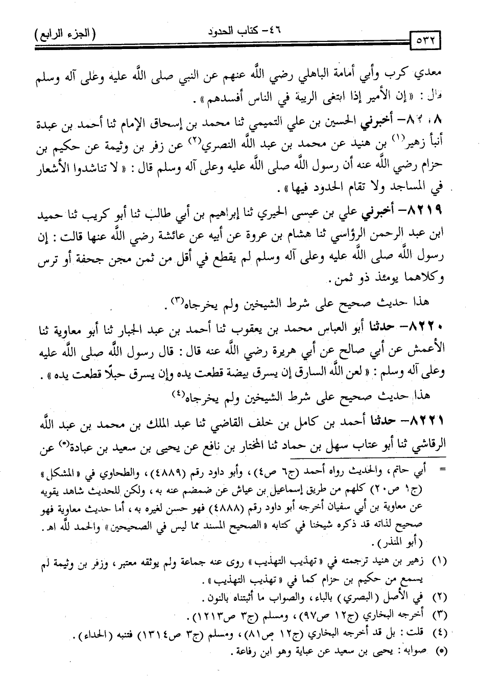 8219 - حَدَّثَنَا عَلِيُّ بْنُ عِيسَى الْحِيرِيُّ ، ثَنَا إِبْرَاهِيمُ بْنُ أَبِي طَالِبٍ ، ثَنَا أَبُو كُرَيْبٍ ، ثَنَا حُمَيْدُ بْنُ عَبْدِ الرَّحْمَنِ الرُّوَاسِيُّ ، ثَنَا هِشَامُ بْنُ عُرْوَةَ ، عَنْ أَبِيهِ ، عَنْ عَائِشَةَ رَضِيَ اللَّهُ عَنْهَا قَالَتْ: " إِنَّ رَسُولَ اللَّهِ صَلَّى اللَّهُ عَلَيْهِ وَسَلَّمَ لَمْ يَقْطَعْ فِي أَقَلَّ مِنْ ثَمَنِ مِجَنِّ جَحْفَةٍ أَوْ تُرْسٍ وَكِلَاهُمَا يَوْمَئِذٍ ذُو ثَمَنٍ "