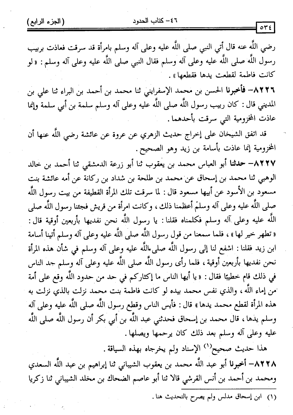 8227 - حَدَّثَنَا أَبُو الْعَبَّاسِ مُحَمَّدُ بْنُ يَعْقُوبَ ، ثَنَا أَبُو زُرْعَةَ الدِّمَشْقِيُّ ، ثَنَا أَحْمَدُ بْنُ خَالِدٍ الْوَهْبِيُّ ، ثَنَا مُحَمَّدُ بْنُ إِسْحَاقَ ، عَنْ مُحَمَّدِ بْنِ طَلْحَةَ بْنِ شَدَّادِ بْنِ رُكَانَةَ ، عَنْ أُمِّهِ عَائِشَةَ بِنْتِ مَسْعُودِ بْنِ الْأَسْوَدِ ، عَنْ أَبِيهَا مَسْعُودٍ ، قَالَ: لَمَّا سَرَقَتْ تِلْكَ الْمَرْأَةُ الْقَطِيفَةَ مِنْ بَيْتِ رَسُولِ اللَّهِ صَلَّى اللَّهُ عَلَيْهِ وَسَلَّمَ أَعْظَمْنَا ذَلِكَ وَكَانَتِ امْرَأَةً مِنْ قُرَيْشٍ ، فَجِئْنَا رَسُولَ اللَّهِ صَلَّى اللَّهُ عَلَيْهِ وَسَلَّمَ فَكَلَّمْنَاهُ فَقُلْنَا: يَا رَسُولَ اللَّهِ ، نَحْنُ نَفْدِيهَا بِأَرْبَعِينَ أُوقِيَّةً ، قَالَ: " تَطَّهَّرُ خَيْرٌ لَهَا " فَلَمَّا سَمِعْنَا مِنْ قَوْلِ رَسُولِ اللَّهِ صَلَّى اللَّهُ عَلَيْهِ وَسَلَّمَ أَتَيْنَا أُسَامَةَ بْنَ زَيْدٍ فَقُلْنَا: اشْفَعْ لَنَا إِلَى رَسُولِ اللَّهِ صَلَّى اللَّهُ عَلَيْهِ وَسَلَّمَ فِي شَأْنِ هَذِهِ الْمَرْأَةِ نَحْنُ نَفْدِيهَا بِأَرْبَعِينَ أُوقِيَّةً ، فَلَمَّا رَأَى رَسُولُ اللَّهِ صَلَّى اللَّهُ عَلَيْهِ وَسَلَّمَ جِدَّ النَّاسِ فِي ذَلِكَ قَامَ خَطِيبًا ، فَقَالَ: " يَا أَيُّهَا النَّاسُ ، مَا إِكْثَارُكُمْ فِي حَدٍّ مِنْ حُدُودِ اللَّهِ وَقَعَ عَلَى أَمَةٍ مِنْ إِمَاءِ اللَّهِ ، وَالَّذِي نَفْسُ مُحَمَّدٍ بِيَدِهِ ، لَوْ كَانَتْ فَاطِمَةُ بِنْتُ مُحَمَّدٍ نَزَلَتْ بِالَّذِي بِهِ هَذِهِ الْمَرْأَةُ لَقَطَعَ مُحَمَّدٌ يَدَهَا " قَالَ: فَأَيِسَ النَّاسُ وَقَطَعَ رَسُولُ اللَّهِ صَلَّى اللَّهُ عَلَيْهِ وَسَلَّمَ يَدَهَا قَالَ مُحَمَّدُ بْنُ إِسْحَاقَ: فَحَدَّثَنِي عَبْدُ اللَّهِ بْنُ أَبِي بَكْرٍ " أَنَّ رَسُولَ اللَّهِ صَلَّى اللَّهُ عَلَيْهِ وَسَلَّمَ بَعْدَ ذَلِكَ كَانَ يَرْحَمُهَا وَيَصِلَهَا "