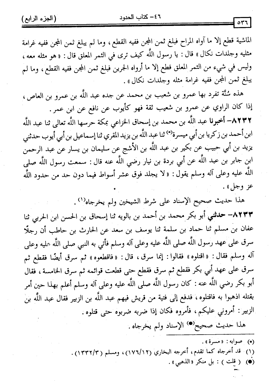 8233 - حَدَّثَنِي أَبُو بَكْرٍ مُحَمَّدُ بْنُ أَحْمَدَ بْنِ بَالَوَيْهِ ، ثَنَا إِسْحَاقُ بْنُ الْحَسَنِ بْنِ الْحَرْبِيِّ ، ثَنَا عَفَّانُ بْنُ مُسْلِمٍ ، ثَنَا حَمَّادُ بْنُ سَلَمَةَ ، ثَنَا يُوسُفُ بْنُ سَعْدٍ ، عَنِ الْحَارِثِ بْنِ حَاطِبٍ ، أَنَّ رَجُلًا سَرَقَ عَلَى عَهْدِ رَسُولِ اللَّهِ صَلَّى اللَّهُ عَلَيْهِ وَسَلَّمَ فَأُتِيَ بِهِ النَّبِيُّ صَلَّى اللَّهُ عَلَيْهِ وَسَلَّمَ فَقَالَ: " اقْتُلُوهُ " . فَقَالُوا: إِنَّمَا سَرَقَ . قَالَ: " فَاقْطَعُوهُ " . ثُمَّ سَرَقَ أَيْضًا فَقُطِعَ ، ثُمَّ سَرَقَ عَلَى عَهْدِ أَبِي بَكْرٍ فَقُطِعَ ، ثُمَّ سَرَقَ فَقُطِعَ حَتَّى قُطِعَتْ قَوَائِمُهُ ثُمَّ سَرَقَ الْخَامِسَةَ فَقَالَ أَبُو بَكْرٍ رَضِيَ اللَّهُ عَنْهُ: كَانَ رَسُولُ اللَّهِ صَلَّى اللَّهُ عَلَيْهِ وَسَلَّمَ أَعْلَمَ بِهَذَا حِينَ أَمَرَ بِقَتْلِهِ ، اذْهَبُوا بِهِ فَاقْتُلُوهُ ، فَدُفِعَ إِلَى فِتْيَةٍ مِنْ قُرَيْشٍ فِيهِمْ عَبْدُ اللَّهِ بْنُ الزُّبَيْرِ ، فَقَالَ عَبْدُ اللَّهِ بْنُ الزُّبَيْرِ: أَمِّرُونِي عَلَيْكُمْ ، فَأَمَّرُوهُ فَكَانَ إِذَا ضَرَبَهُ ضَرَبُوهُ حَتَّى قَتَلُوهُ
