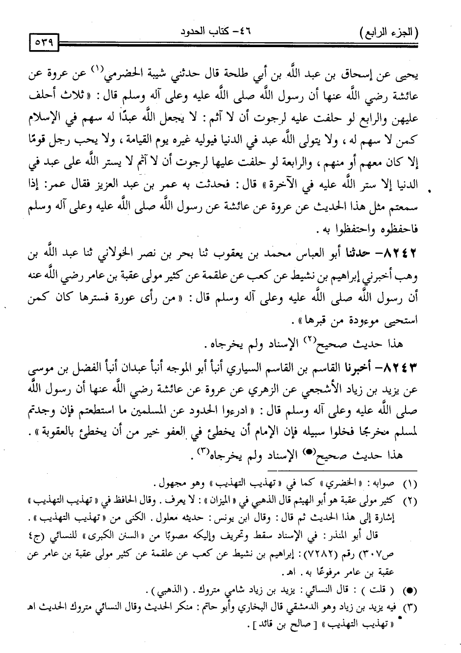 8243 - أَخْبَرَنَا الْقَاسِمُ بْنُ الْقَاسِمِ السَّيَّارِيُّ ، أَنْبَأَ أَبُو الْمُوَجَّهِ ، أَنْبَأَ عَبْدَانُ ، أَنْبَأَ الْفَضْلُ بْنُ مُوسَى ، عَنْ يَزِيدَ بْنِ زِيَادٍ الْأَشْجَعِيِّ ، عَنِ الزُّهْرِيِّ ، عَنْ عُرْوَةَ ، عَنْ عَائِشَةَ رَضِيَ اللَّهُ عَنْهَا ، أَنَّ رَسُولَ اللَّهِ صَلَّى اللَّهُ عَلَيْهِ وَسَلَّمَ قَالَ: " ادْرَءُوا الْحُدُودَ عَنِ الْمُسْلِمِينَ مَا اسْتَطَعْتُمْ ، فَإِنْ وَجَدْتُمْ لِمُسْلِمٍ مَخْرَجًا فَخَلُّوا سَبِيلَهُ ، فَإِنَّ الْإِمَامَ أَنْ يُخْطِئَ فِي الْعَفْوِ خَيْرٌ مِنْ أَنْ يُخْطِئَ بِالْعُقُوبَةِ "